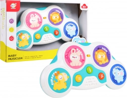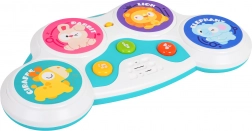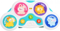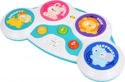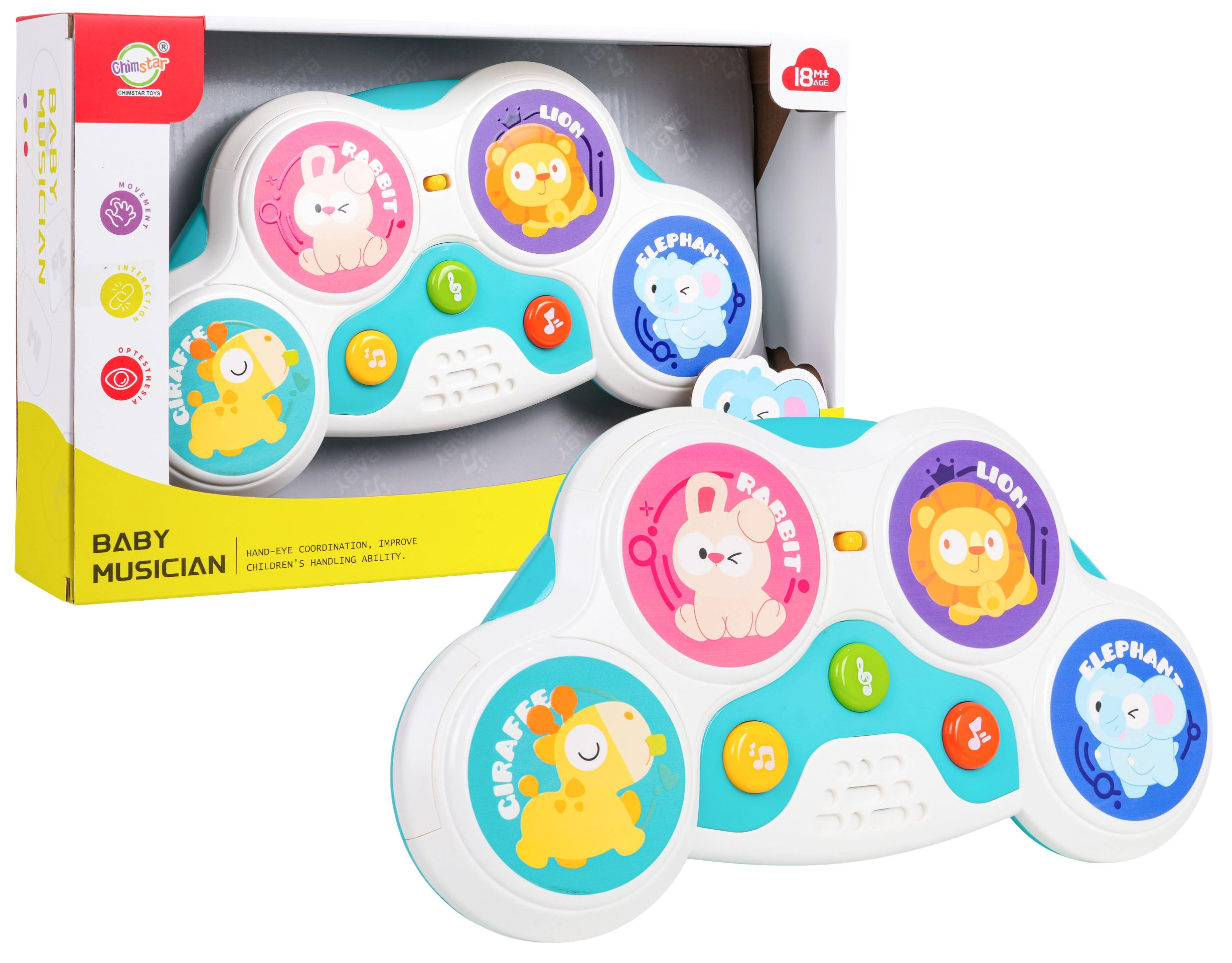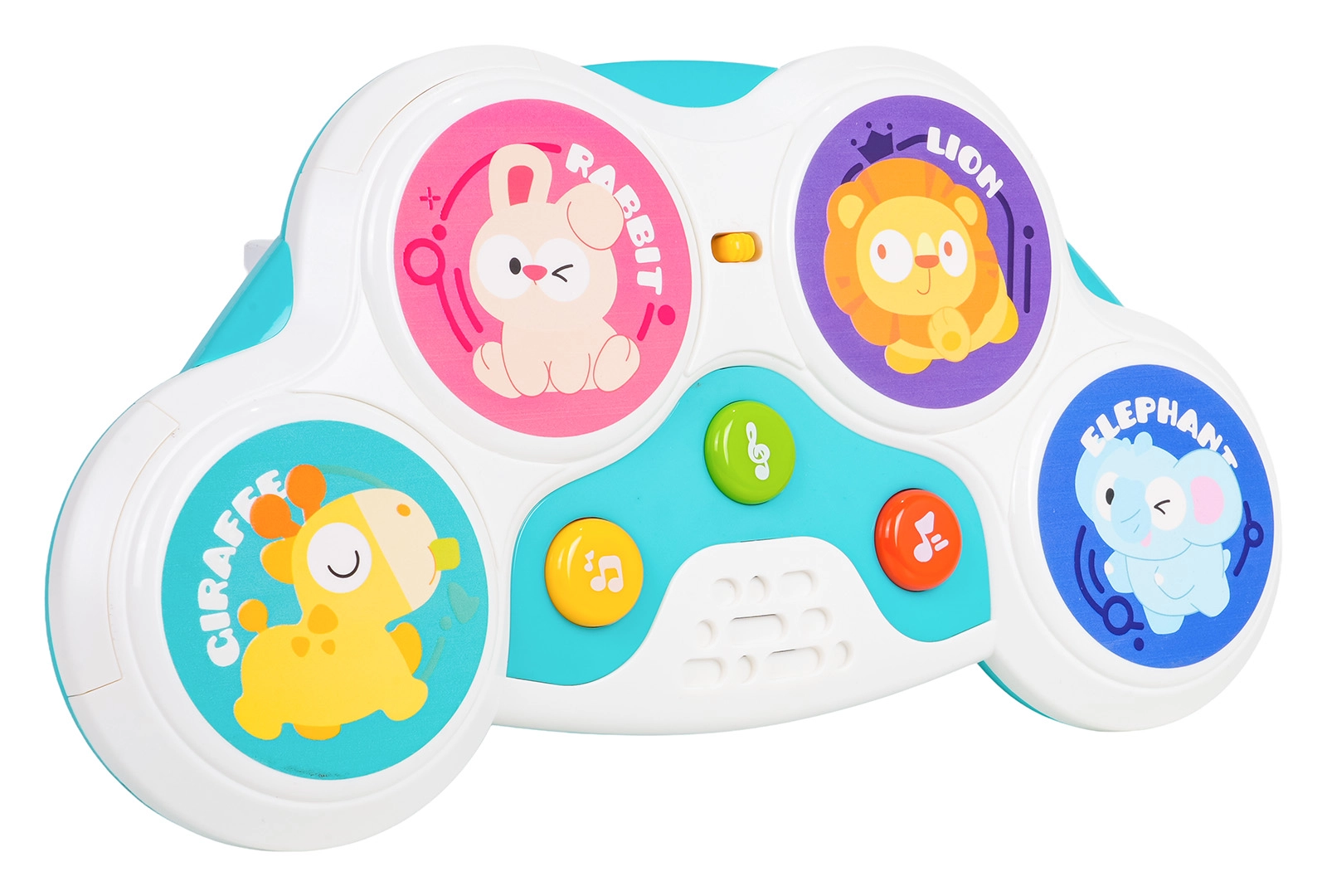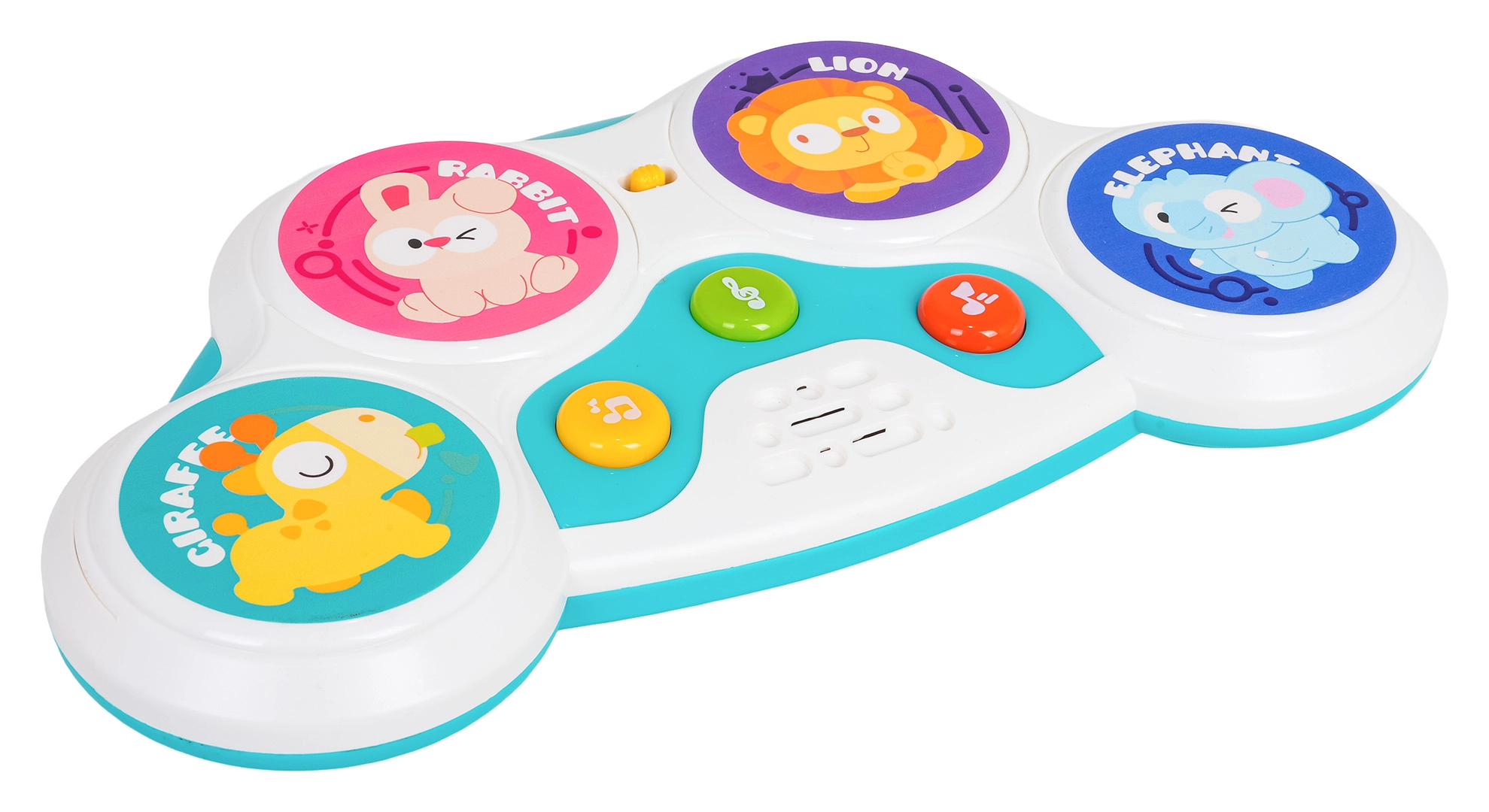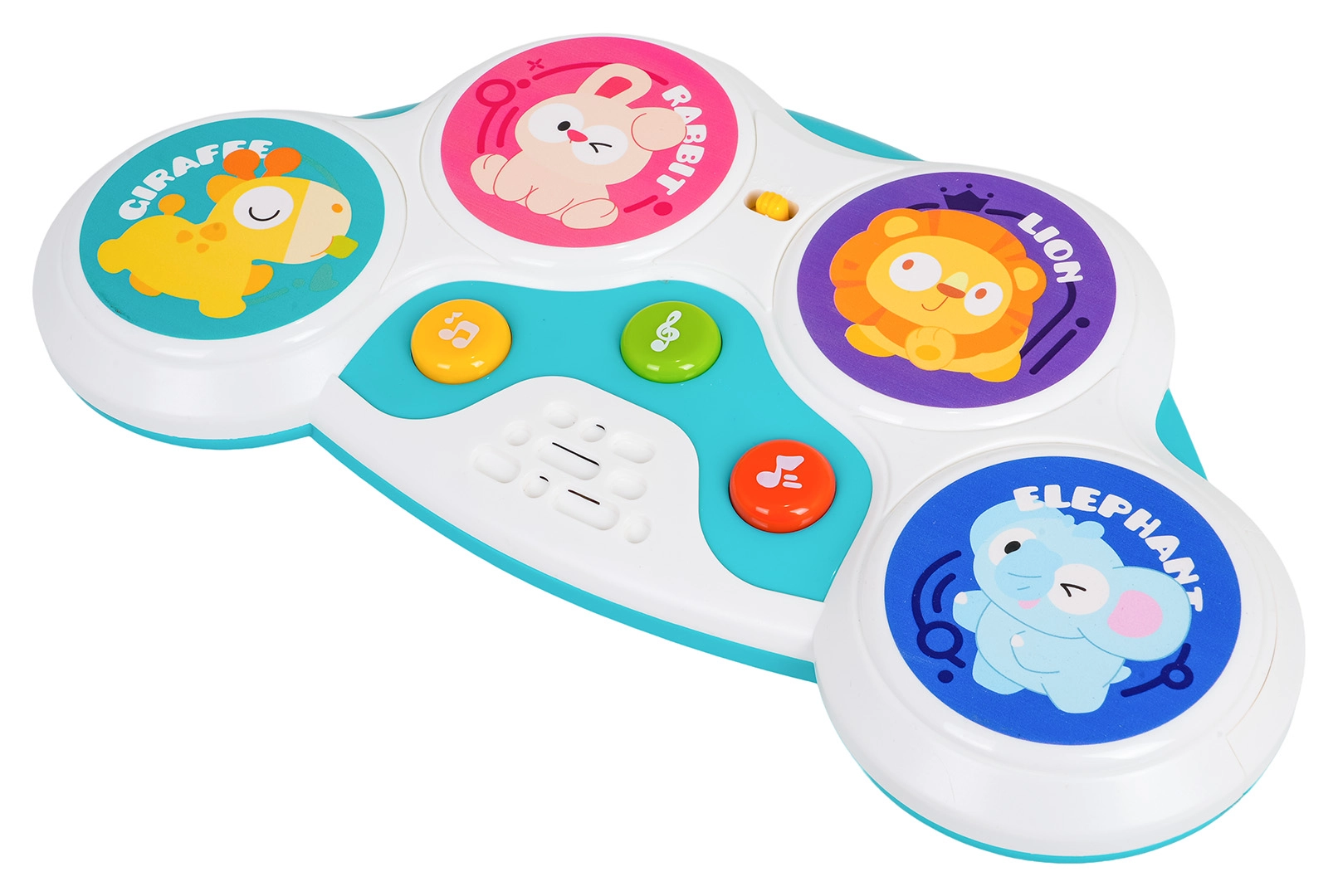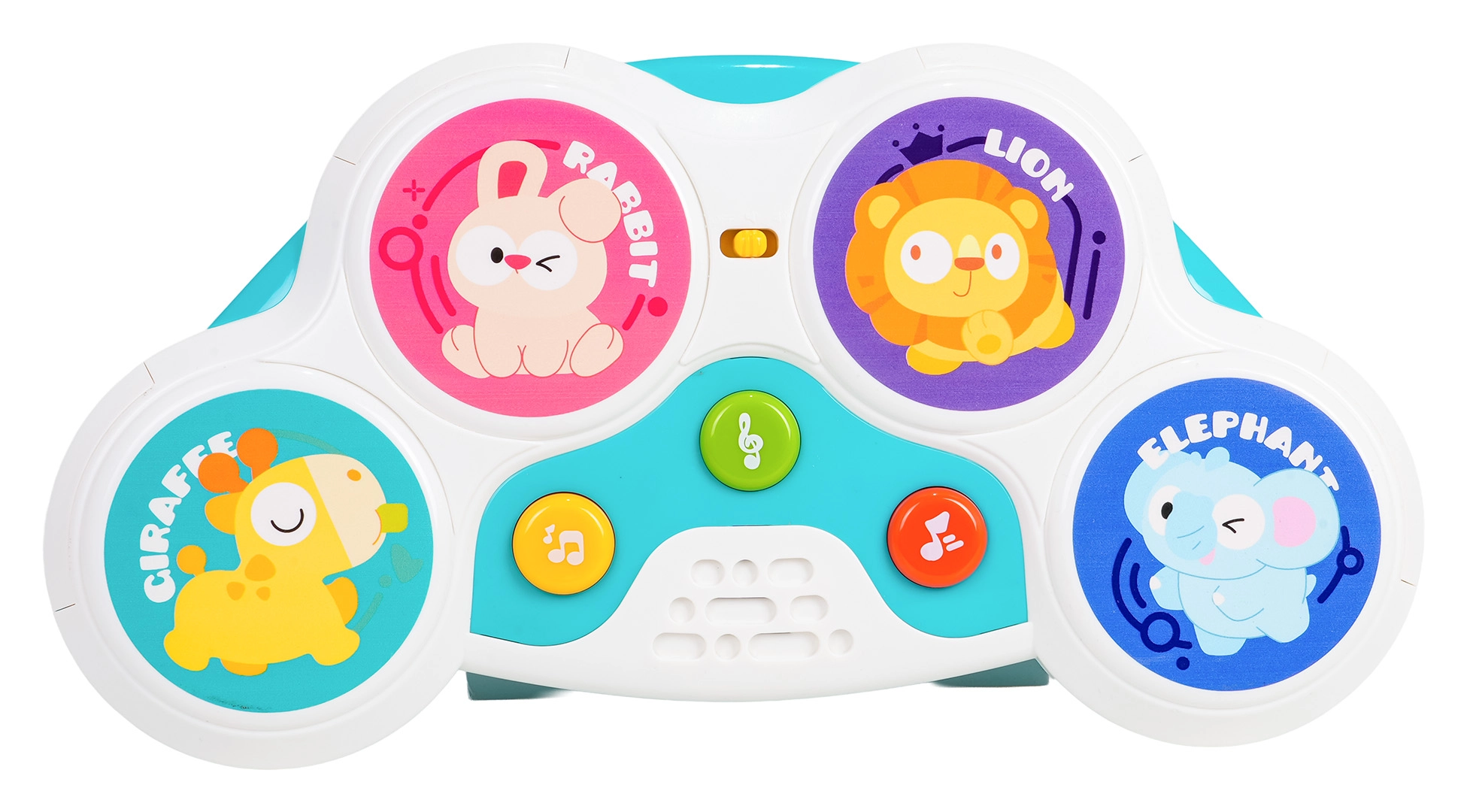 Patru zone colorate cu iepuraș, leu, girafă și elefant declanșează sunete de animale, melodii și ritmuri de tobe – distracție la o singură atingere.