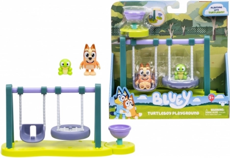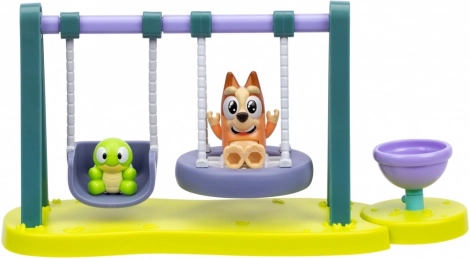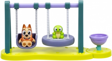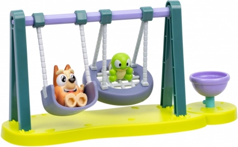 Acest mini set de joacă cu leagăne plin de culoare îi va încânta pe toți micii fani BLUEY. Două leagăne funcționale și bolul/caruselul rotativ invită la povești nesfârșite pe terenul de joacă. Copiii îi pot așeza pe Bingo și pe țestoasă, îi pot legăna înainte și înapoi și apoi îi pot roti până când se învârte totul de bucurie.