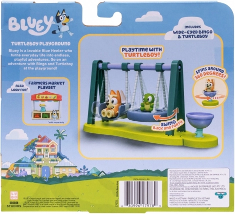 Pune imaginația în mișcare cu adorabilul set de joacă din serialul pentru copii BLUEY. Așază-i pe Bingo și pe micuța țestoasă pe leagăne, rotește-i pe carusel/bol și bucurați-vă de ore întregi de joacă creativă. Include o figurină Bingo exclusivă cu brațe și picioare articulate – accesoriul perfect pentru lumea Bluey.