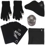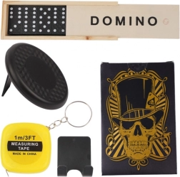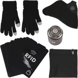 - cravată de Crăciun, șosete, căciulă Santa, papion sclipitor, domino, ruletă, accesorii poker, cuier, suport pentru ochelari, mănuși tactile, mască de iarnă, brâu sport cu buzunar, portcard, aparat de ras, mini ventilator USB‑C, suport de telefon, ciocan de siguranță 3‑în‑1, lanternă frontală, stand pentru telefon, cuțit cu lamă retractabilă, set de încărcare, pahare shot din inox, set mustăți, șablon pentru măsurarea adâncimii profilului anvelopei