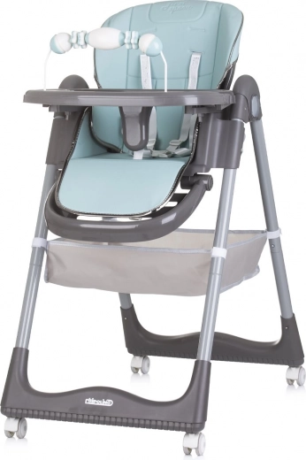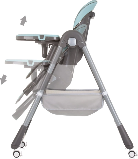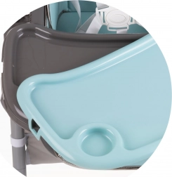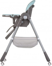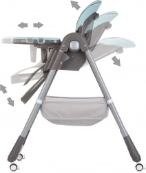 Tava dublă, cu partea superioară detașabilă, ușurează întreținerea, iar glisarea în 4 poziții se adaptează fiecărei situații. Bara cu jucării distrează bebelușul, astfel încât dvs. puteți pregăti masa în liniște. Cele patru roți facilitează mutarea prin apartament, iar coșul de depozitare păstrează la îndemână toate mărunțișurile necesare. După masă, scaunul se pliază rapid și compact pentru a economisi spațiu.