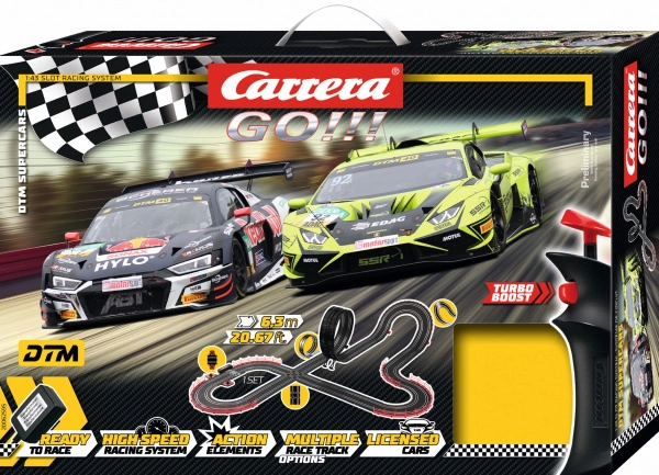 Trăiește curse palpitante cu pista auto CARRERA GO DTM Supercars, lungime 6,3 m, cu modelele spectaculoase Audi R8 LMS GT3 și Lamborghini Huracán GT3. Setul oferă viraje înclinate, looping, intersecție și contor mecanic de ture pentru o atmosferă autentică de cursă. Datorită controlelor cu turbo, periilor de contact duble și magneților, mașinile aderă excelent pe pistă și asigură o conducere rapidă și lină.