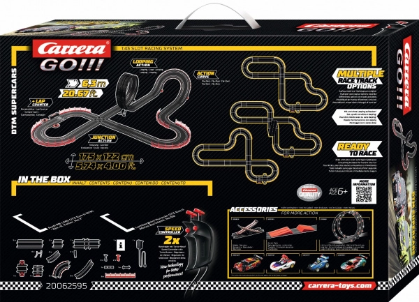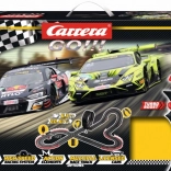 Pista CARRERA GO la scara 1:43 aduce adrenalina direct în sufrageria ta. Construiește un traseu de 6,3 m cu dimensiuni asamblate de 175 × 122 cm și bucură-te de dueluri dinamice între iconicele GT3 Audi R8 LMS și Lamborghini Huracán. Mulțumită construcției inteligente, pista se montează și demontează ușor și oferă numeroase configurații posibile.