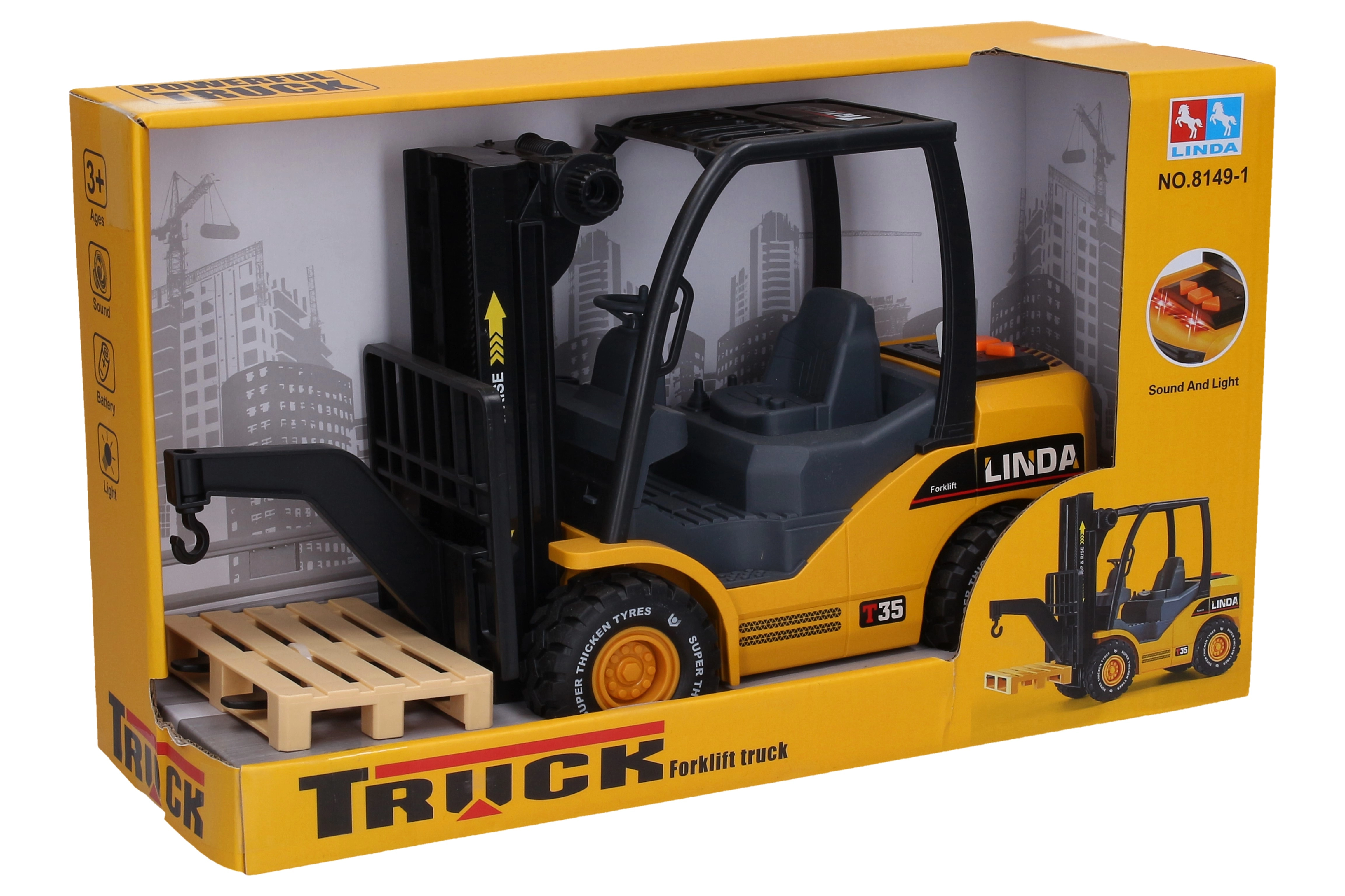 Acest stivuitor realizat cu atenție la detalii îi va încânta pe micii pasionați de utilaje de construcții și depozit. Datorită efectelor luminoase și sonore (motor, ridicare, claxon) și ridicării manuale cu rotița frontală, jocul capătă un caracter foarte realist. Efectele se activează prin butonele din partea din spate, astfel încât copiii au totul la îndemână.