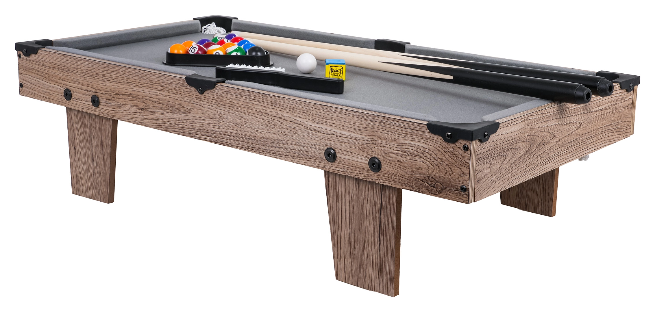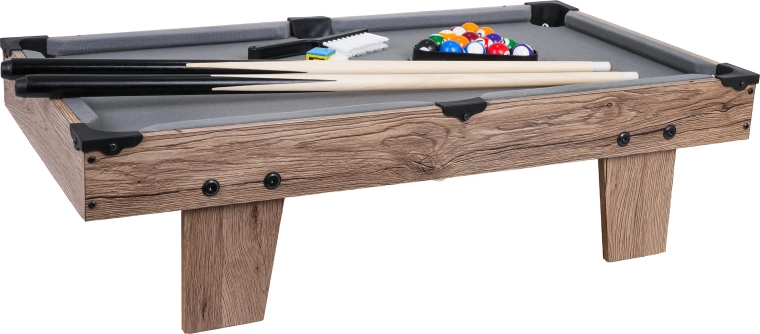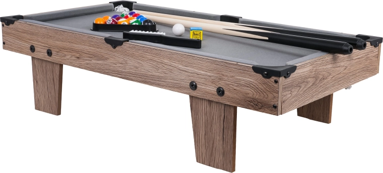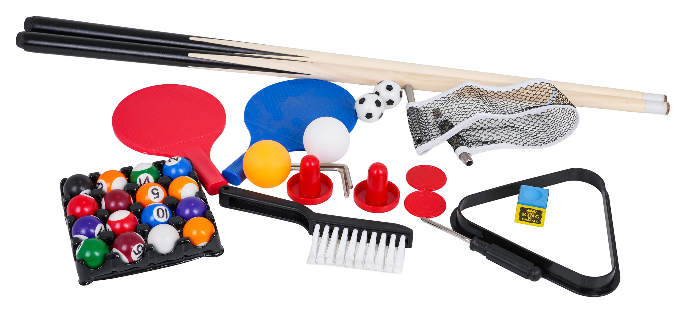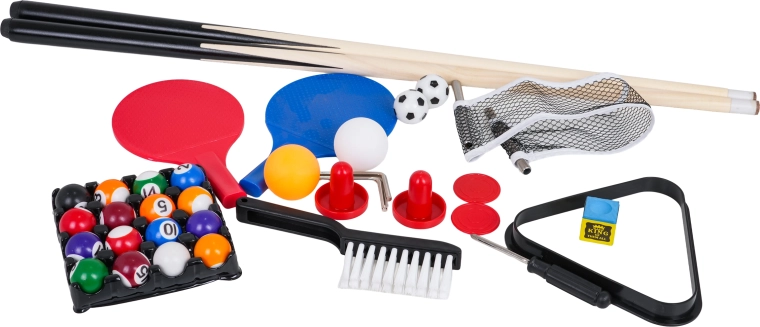- piese de construcție, manual, 2 mingi pentru foosball, 2 tacuri, perie pentru postav, 16 bile + triunghi, 2 palete, 2 mingi de tenis de masă, puc, 2 contoare glisante, plasă, 2 chei, șurubelniță