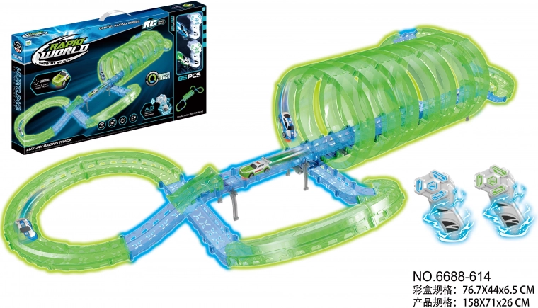 Mașinuțele sunt alimentate de acumulatori reîncărcabili de 3,7 V (incluși în pachet), iar telecomenzile funcționează cu 4× baterii AAA (neincluse). Datorită pieselor fluorescente, pista strălucește în întuneric, iar cursele au o atmosferă unică.