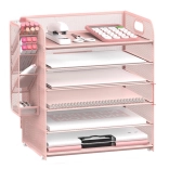 Un organizator metalic stilat pentru birou, în culoare roz, păstrează spațiul de lucru ordonat și elegant. Oferă 5 compartimente spațioase pentru accesorii de birou, este realizat din metal vopsit cu structură din plasă pentru durabilitate și stabilitate. Datorită dimensiunilor compacte, încape pe orice birou și aduce în interior atât ordine, cât și un design modern.