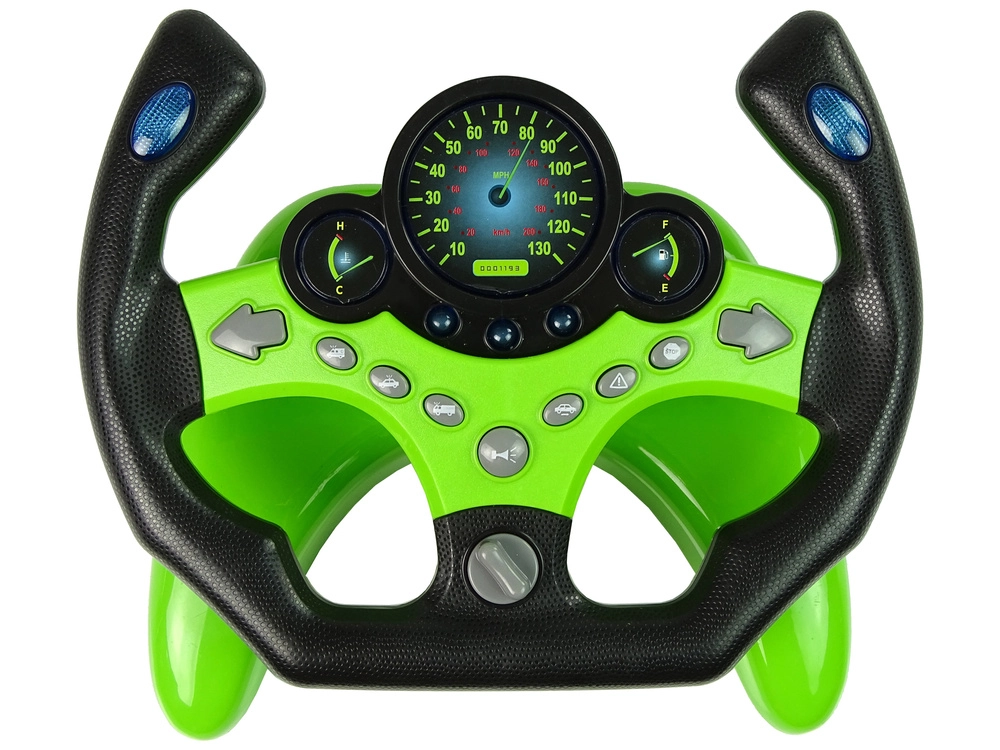 Acest volan pentru copii în culori verde–negru oferă până la 9 butoane funcționale, inclusiv semnalizări, claxon și sunete ale echipajelor de intervenție. La rotirea cheii se aprind indicatoarele de bord cu iluminare albastră, iar micul șofer poate porni pe „șosea”. Baza stabilă cu ventuze menține volanul ferm pe blatul mesei.