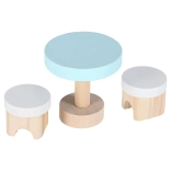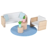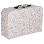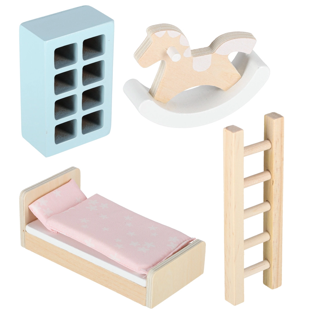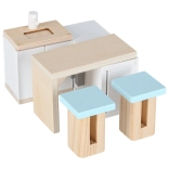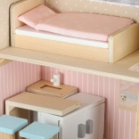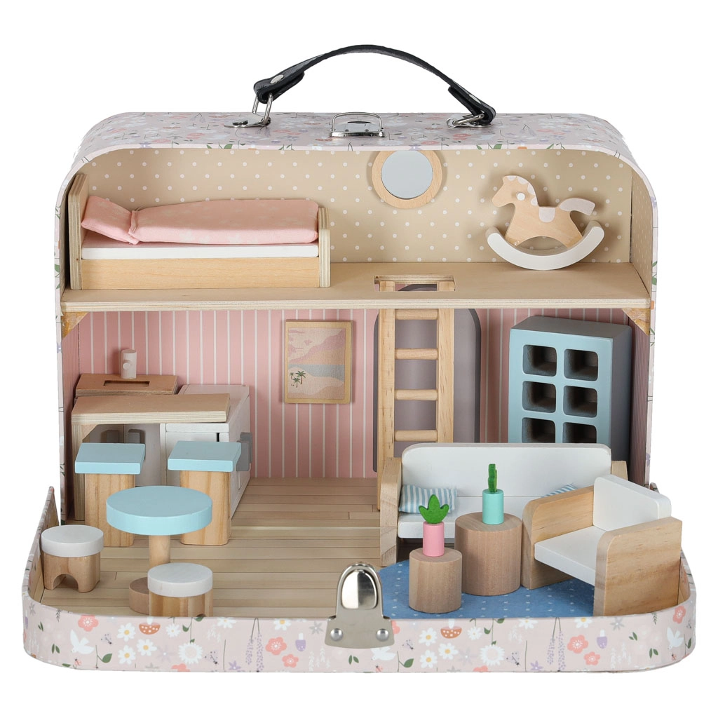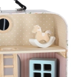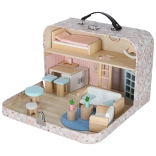 Această mini căsuță pentru păpuși în valiză se transformă, la deschidere, într-un interior pe două niveluri, cu bucătărie, living și dormitor. Culorile pastelate combinate cu lemnul natural creează o atmosferă primitoare și invită la joacă de rol cu păpuși sau figurine.