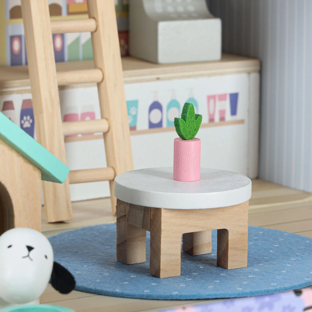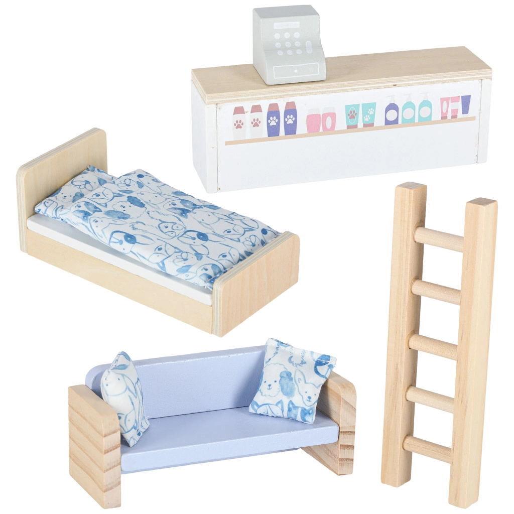Setul include mobilier din lemn de calitate (pătuț cu lenjerie, canapea, masă, raft, scară), elemente de magazin (tejghea și casă de marcat) și un colț pentru animale cu căsuță pentru câine, ansamblu de zgâriat pentru pisică și două boluri. Datorită designului tip valiză, jucăria poate fi luată ușor în vizită, în vacanță sau la joacă în parc – iar după joacă totul se strânge rapid.