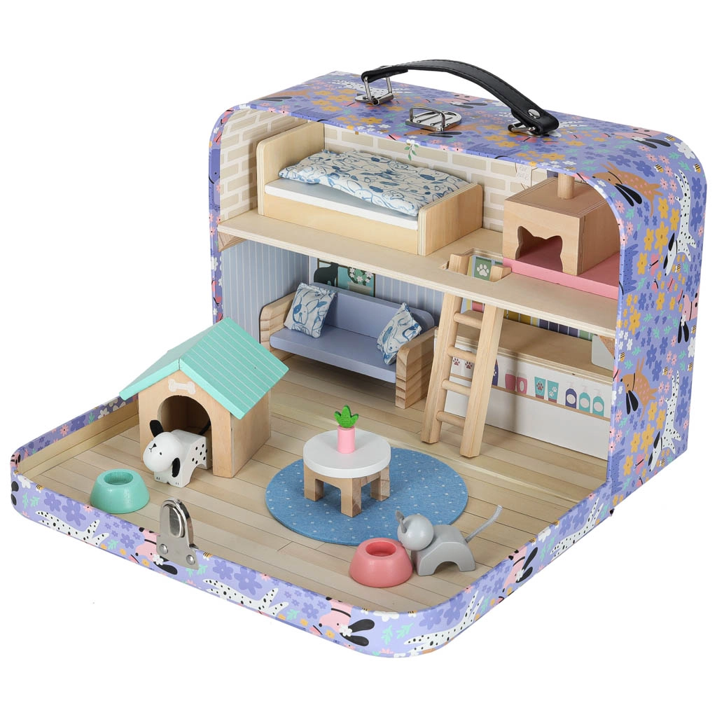 Această căsuță pentru păpuși portabilă, în valiză, se transformă la deschidere într-o mini-locuință pe două niveluri cu ilustrații frumoase. Este ideală ca cadou de zi de naștere sau de Crăciun și va încânta copiii care iubesc animăluțele și poveștile pline de imaginație.