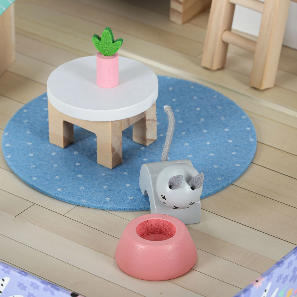 Setul include figurinele unui cățel și ale unei pisici, boluri, căsuță pentru câine și ansamblu de zgâriat pentru pisică – perfect pentru îngrijirea animalelor de companie și jocuri de rol.