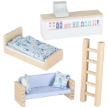 Pătuț cu așternuturi, canapea, masă, raft, scară și elemente de magazin creează multe posibilități pentru joacă creativă.