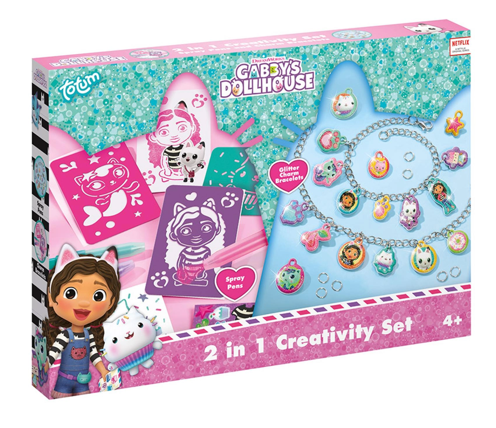 Descoperiți setul creativ distractiv 2în1, cu care copiii își pot crea propriile desene folosind carioci cu suflat și, în plus, își pot confecționa brățări stilate cu pandantive cu motive din GABBY'S DOLLHOUSE. Setul dezvoltă creativitatea, motricitatea fină și imaginația – cadoul ideal pentru micii creatori de la 4 ani.