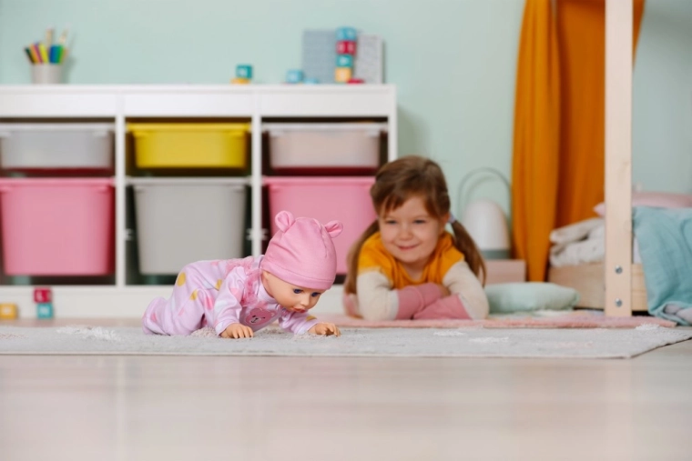 Funcția interactivă de târâre aduce în joc mișcare și noi scenarii de îngrijire a bebelușului.