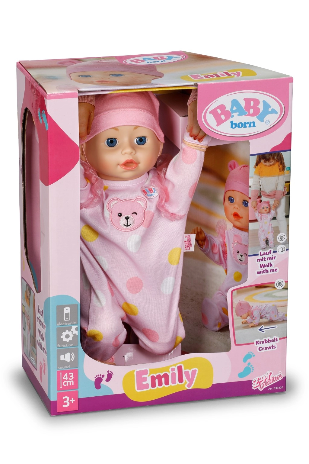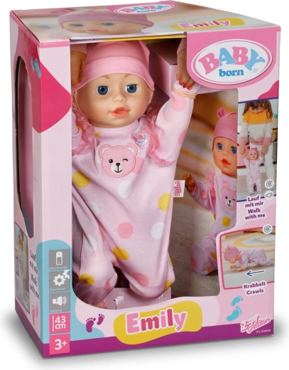 Păpușa BABY born Emily îi motivează pe copii la mișcare și creativitate – un mecanism simplu și sigur permite ca păpușa să pornească în mers sau să se târască pe podea. Astfel, copiii pot imita îngrijirea unui bebeluș, pot inventa povești și, în același timp, își dezvoltă motricitatea fină și grosieră.