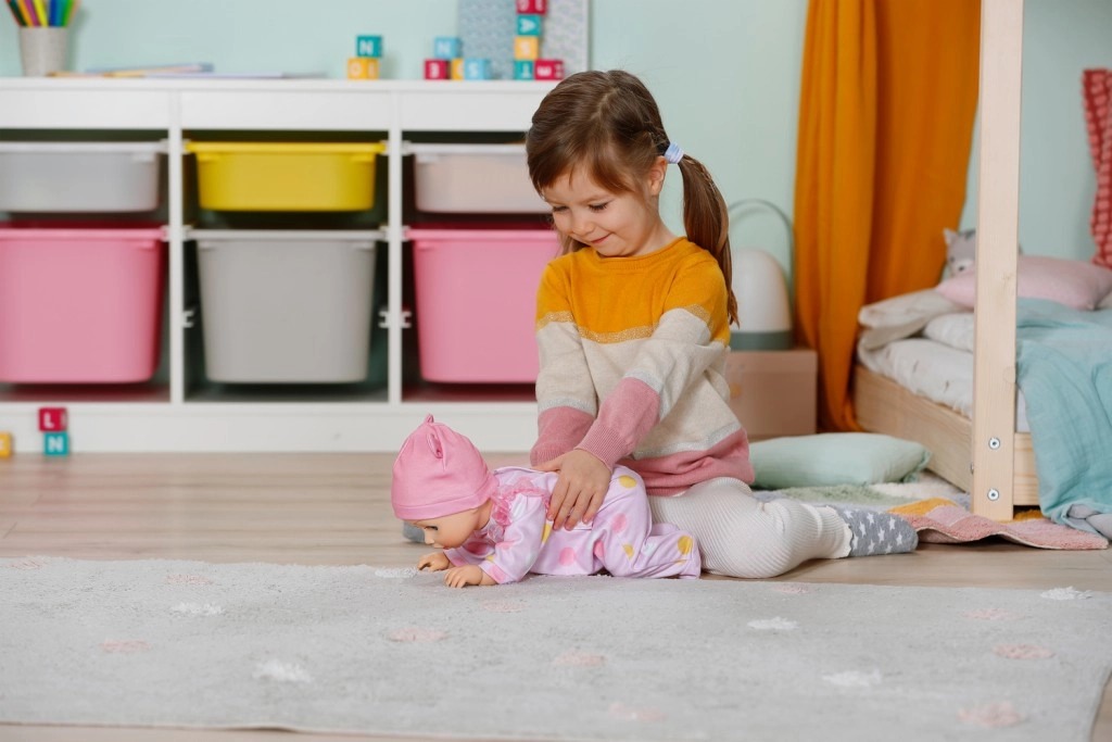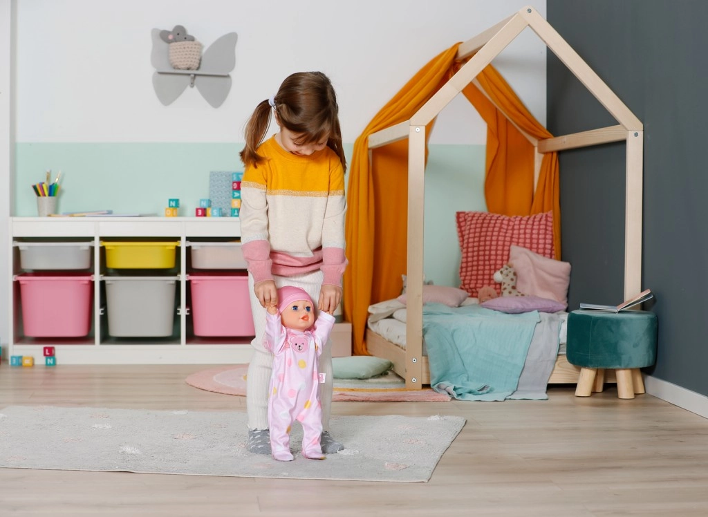 Copiii pot ajuta păpușa să facă pași și astfel își antrenează motricitatea și coordonarea.