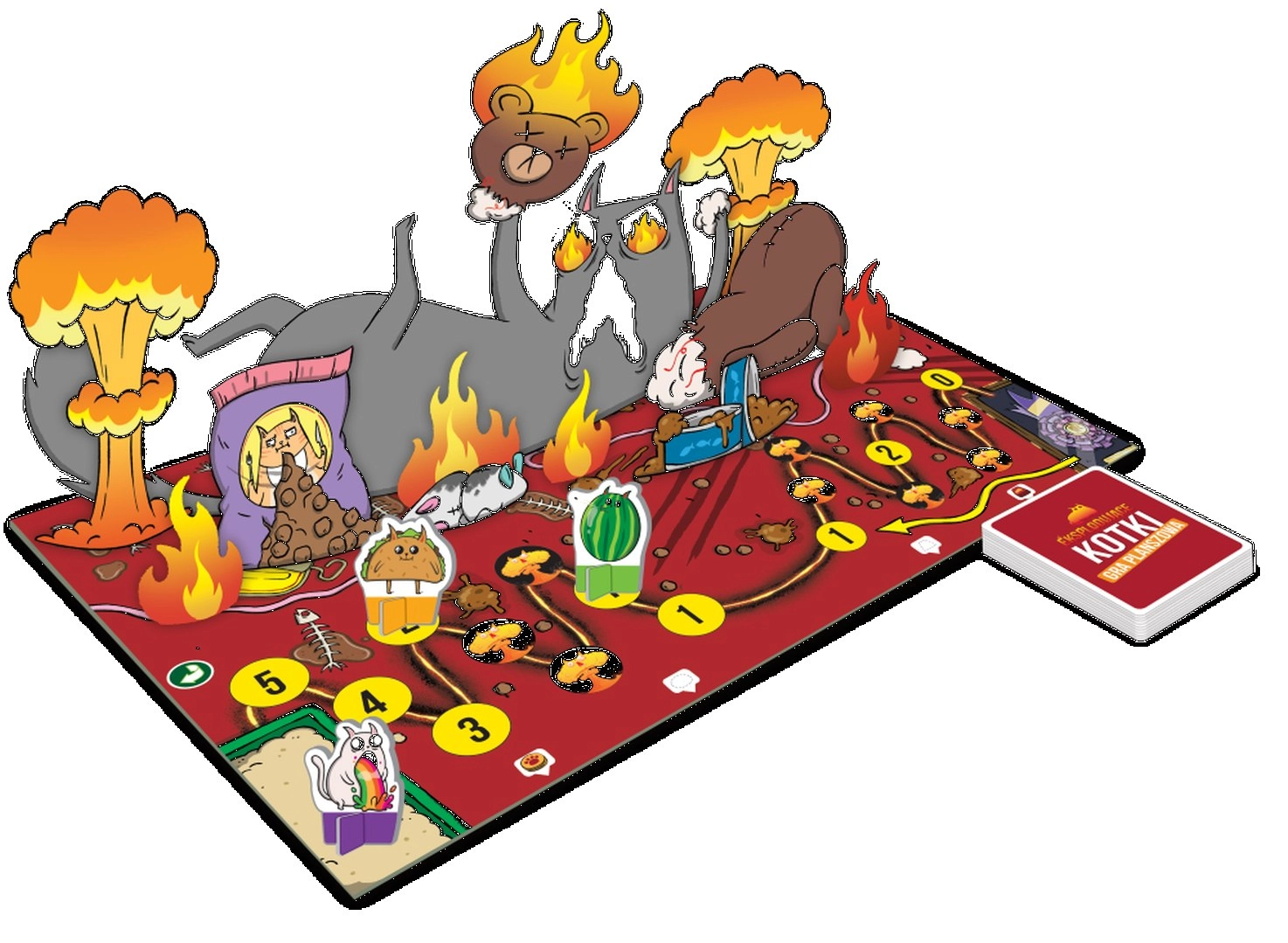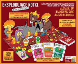 Pisici Explozive: joc de societate transpune energia nebună a popularului joc de cărți pe o tablă de joc. Jucătorii alternează între a juca cărți de acțiune și a trage discuri de mișcare pentru a avansa pe traseu și a ajunge pe câmpul final. Pe parcurs îi așteaptă capcane și sabotaje ale adversarilor, ce pot fi depășite doar prin folosirea inteligentă a cărților de dezamorsare.