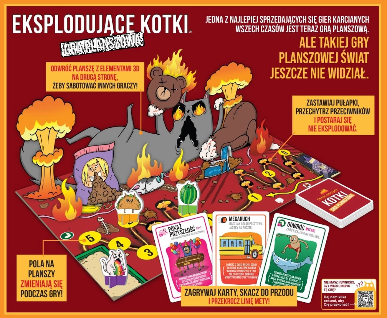 Noua versiune de masă a hitului Pisici Explozive aduce distracție rapidă, palpitantă și imprevizibilă pentru 2–6 jucători. Combină efectele îndrăgite din jocul de cărți original cu mecanici noi de discuri de mișcare și capcane pe o tablă reversibilă. Bucură-te de o strategie dinamică, în care sincronizarea corectă a cărților și dezamorsarea capcanelor decid victoria.