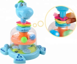 Bączek interactiv în formă de hipopotam îi atrage pe copii de la 12 luni prin culorile vii și biluțele mobile. La apăsarea căpșorului se rotește roata interioară, iar biluțele din burtică încep să sară. Elementele mari, ușor de apucat, trei forme glisante pe gât și materialele sigure cu certificare CE și conformitate cu EN71 susțin motricitatea fină, coordonarea și învățarea culorilor și formelor.
