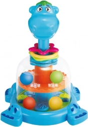Acest hipopotam albastru drăgălaș oferă copiilor ore întregi de distracție plină de bucurie și, în același timp, dezvoltarea unor abilități importante. Apasă pe căpșor și urmărește cum roata din interior începe să se învârtă, iar biluțele colorate sar voioase. Părțile mari sunt concepute pentru mânuțe mici – se țin ușor și sunt plăcute la atingere.