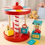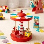 Porniți distracția! Caruselul colorat, cu chioșc de bilete și trei scaune, aduce copiilor povești nesfârșite – de la vânzarea biletelor până la plimbarea maimuței, pisicuței și ursului. Prin rotirea acoperișului, caruselul pornește lin și sprijină înțelegerea cauzei și efectului.
