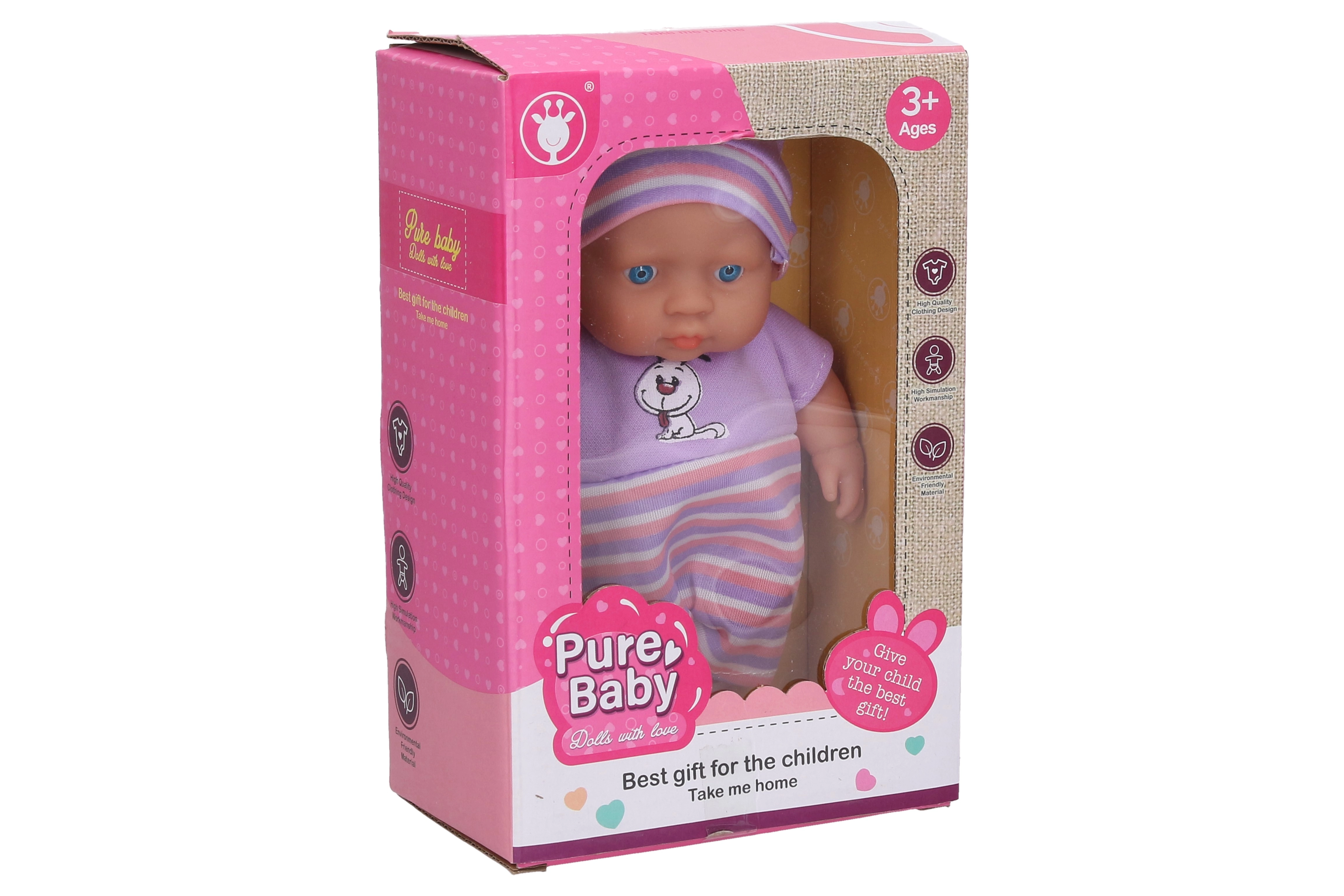 Un bebeluș drăgălaș de culoare mov, cu înălțimea de 18 cm, va încânta orice copil. Este ideal pentru jocurile de rol cu mami și tati, dezvoltă imaginația și grija. Dimensiunea compactă este perfectă pentru călătorii și grădiniță. Moale și plăcut la atingere, ușor de prins de mânuțele copiilor și grozav ca dar.