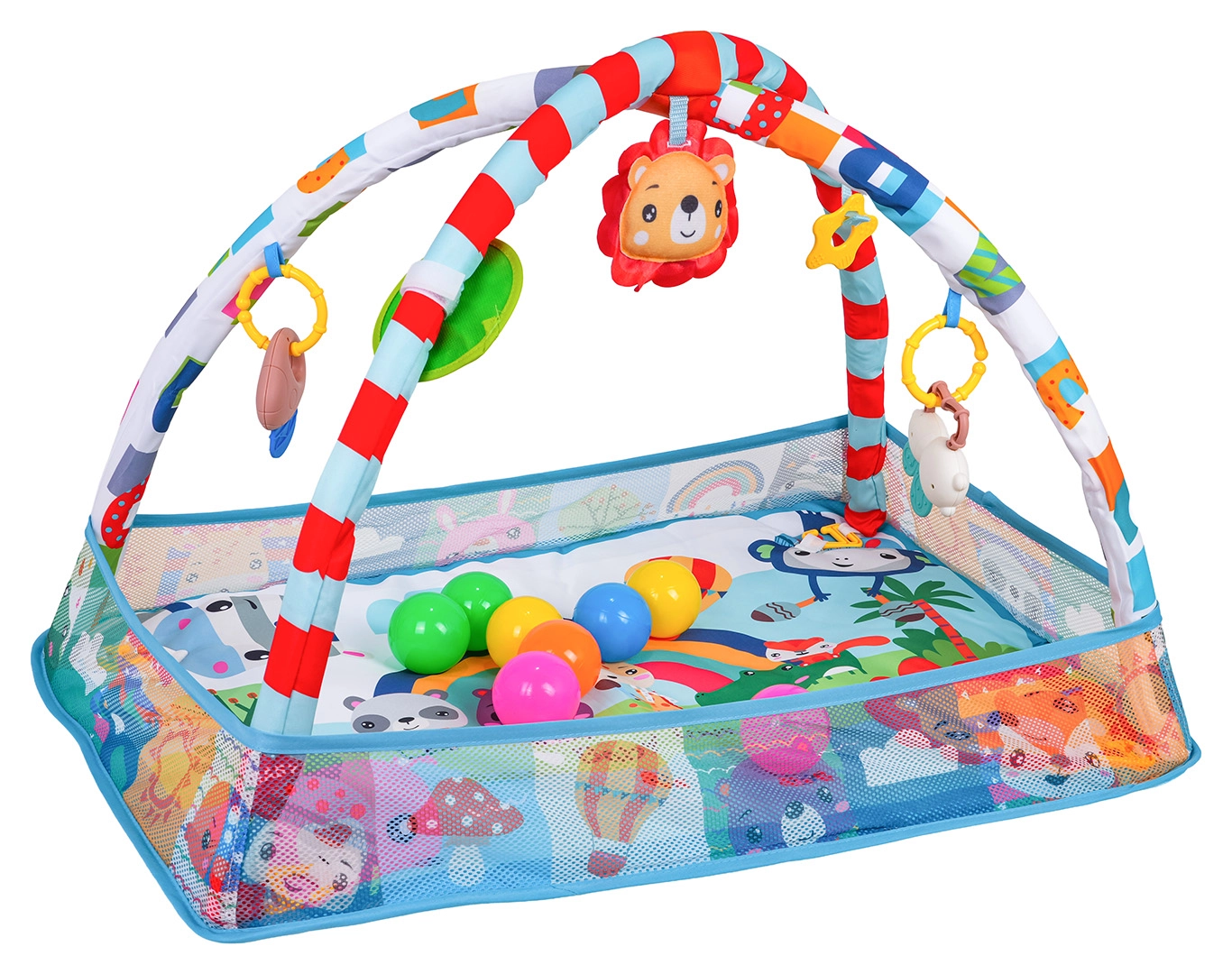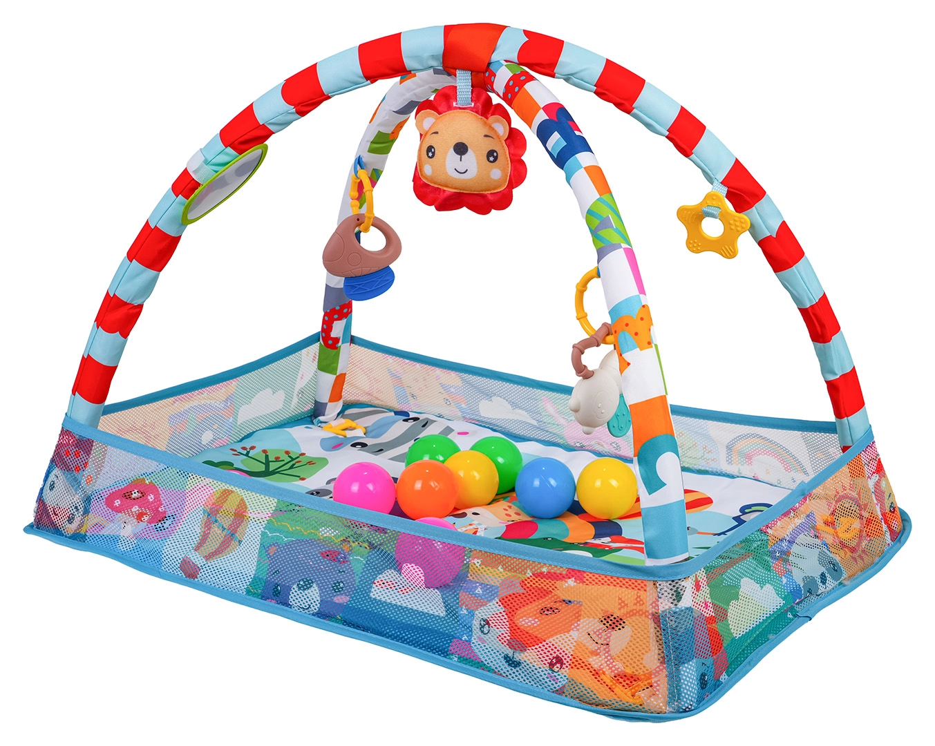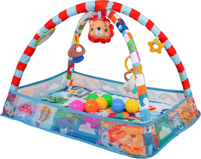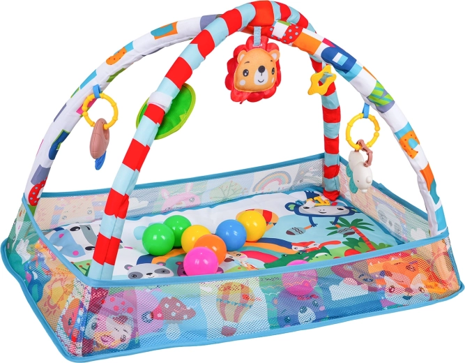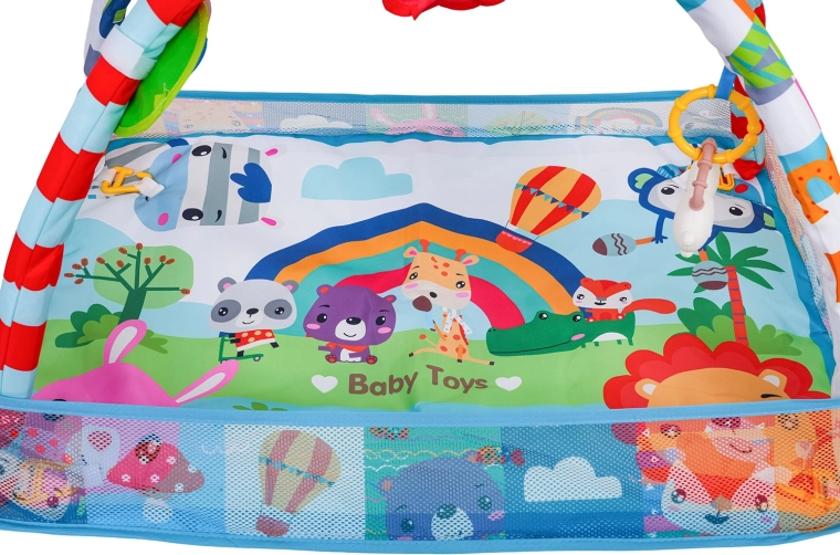 Arcada detașabilă cu jucării suspendate (oglindă sigură, jucării cu zornăitori și inele de dentiție, leu de pluș cu pârâitoare etc.) încurajează copilul să se întindă, să prindă și să exploreze. Salteaua este realizată din materiale sigure, ușor de curățat, are culori vii și o construcție stabilă pentru joaca zilnică.