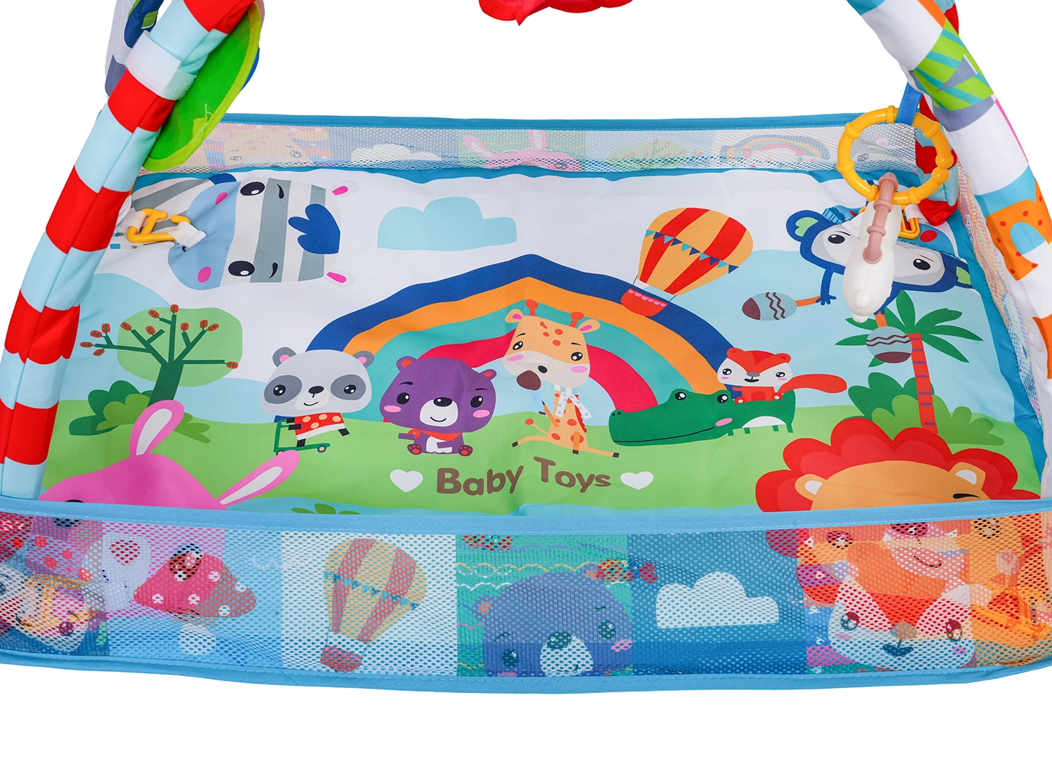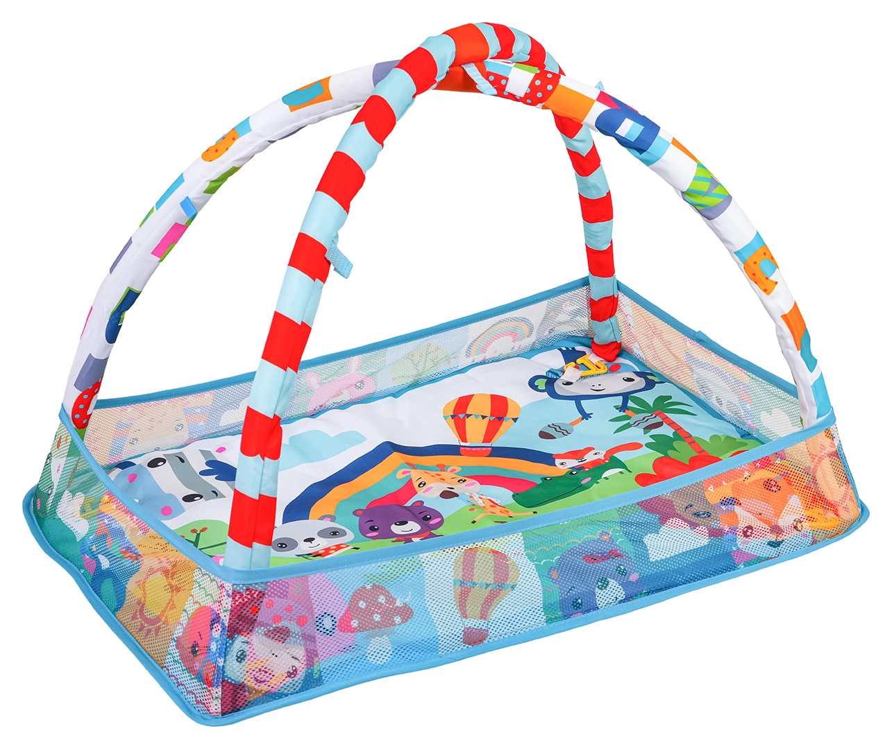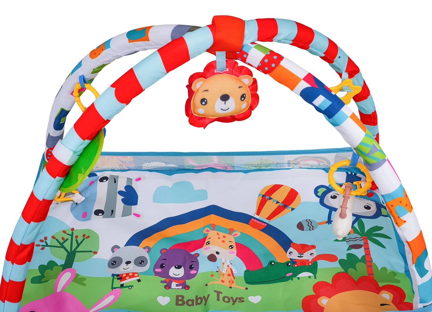 Arcada detașabilă cu jucării suspendate (oglindă sigură, jucării cu zornăitori și inele de dentiție, leu de pluș cu pârâitoare etc.) încurajează copilul să se întindă, să prindă și să exploreze. Salteaua este realizată din materiale sigure, ușor de curățat, are culori vii și o construcție stabilă pentru joaca zilnică.