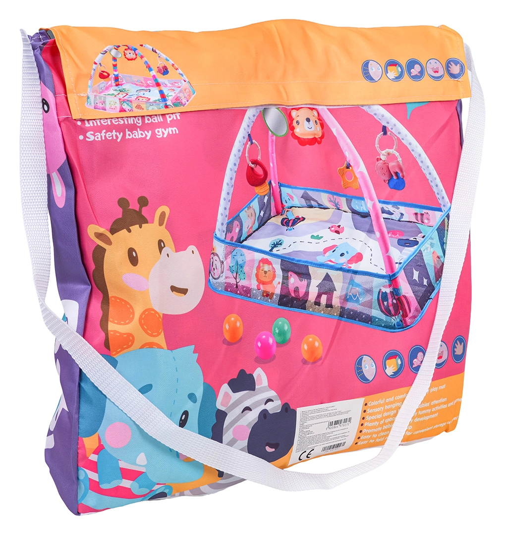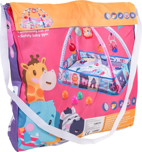 În pachet: saltea cu jucării suspendate, 8× bile din plastic pentru piscina uscată și geantă colorată de umăr pentru transport și depozitare ușoare.