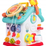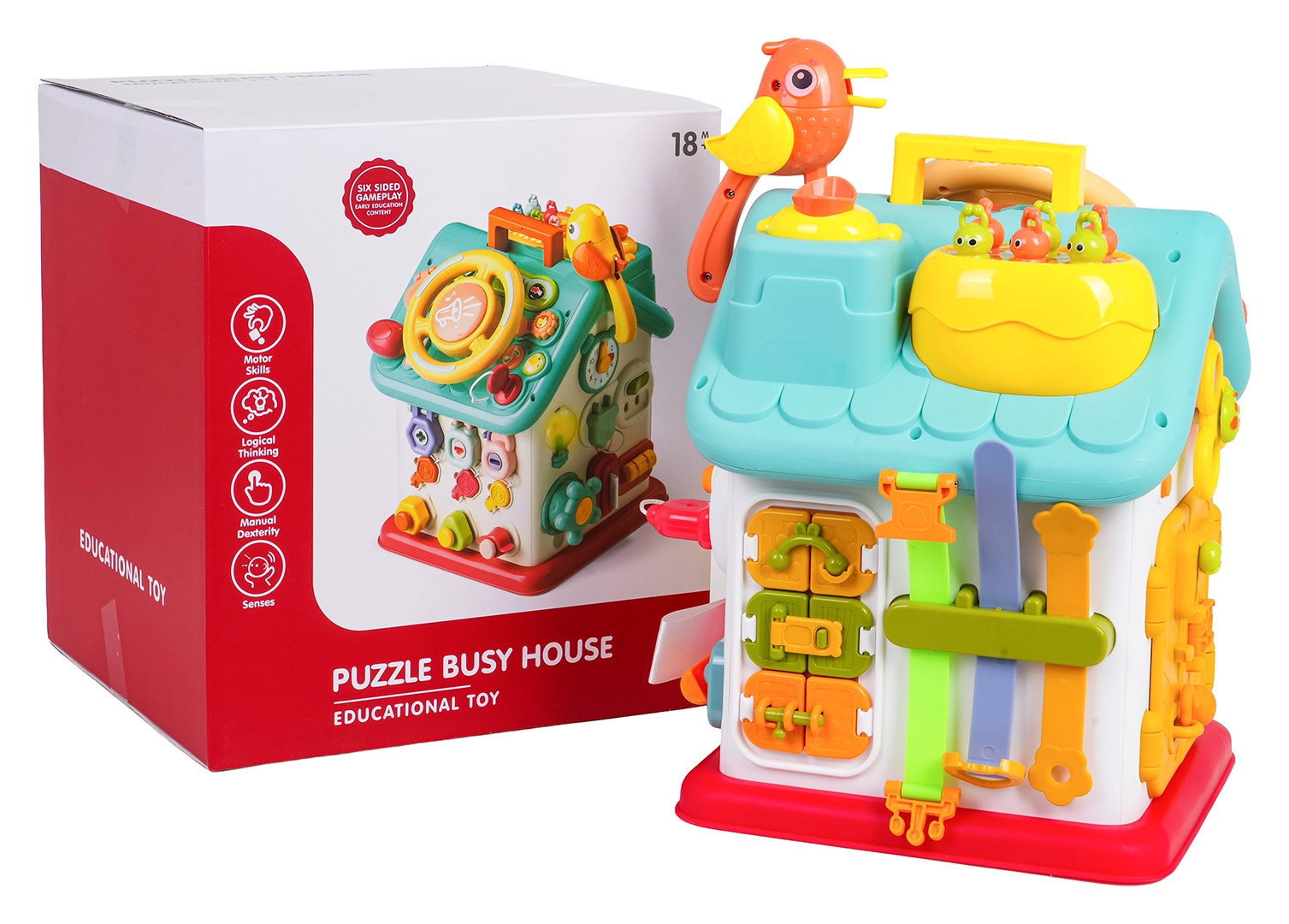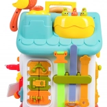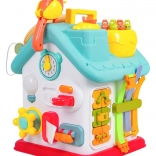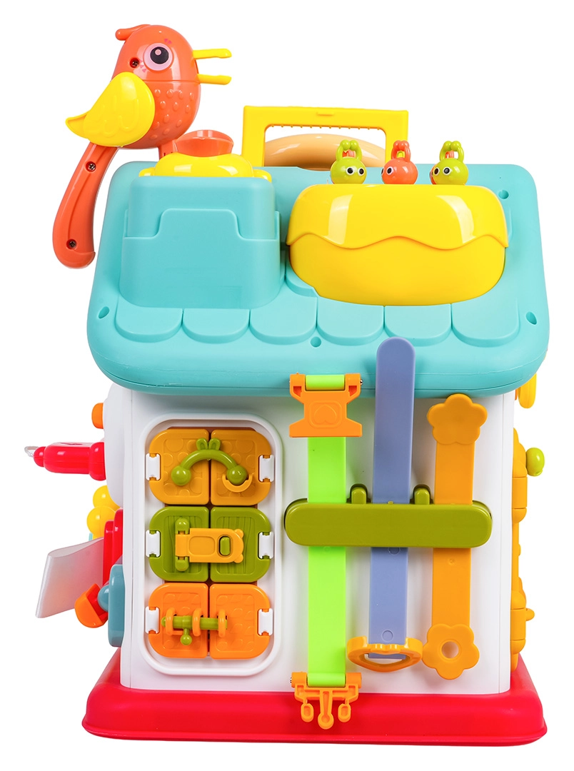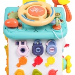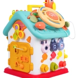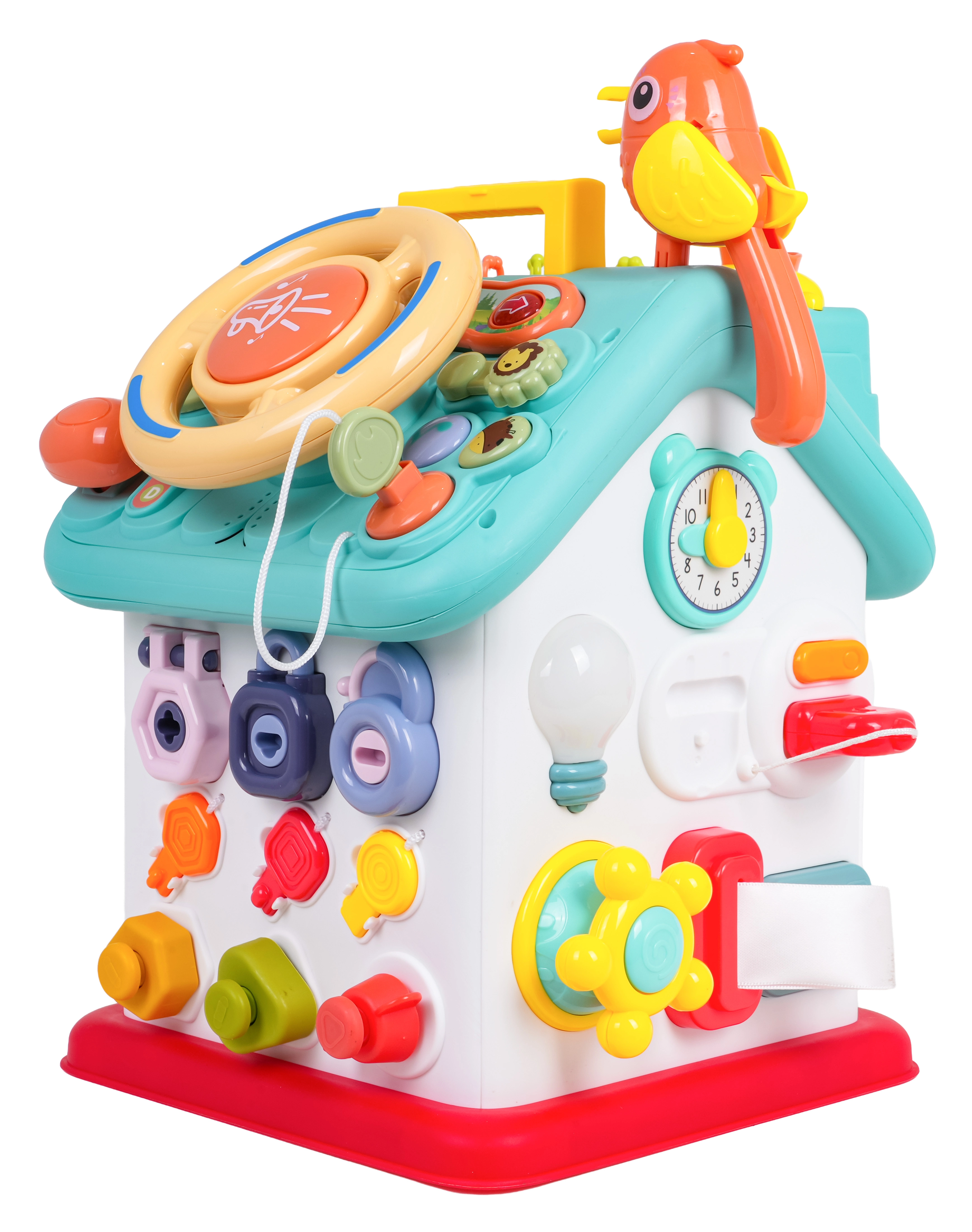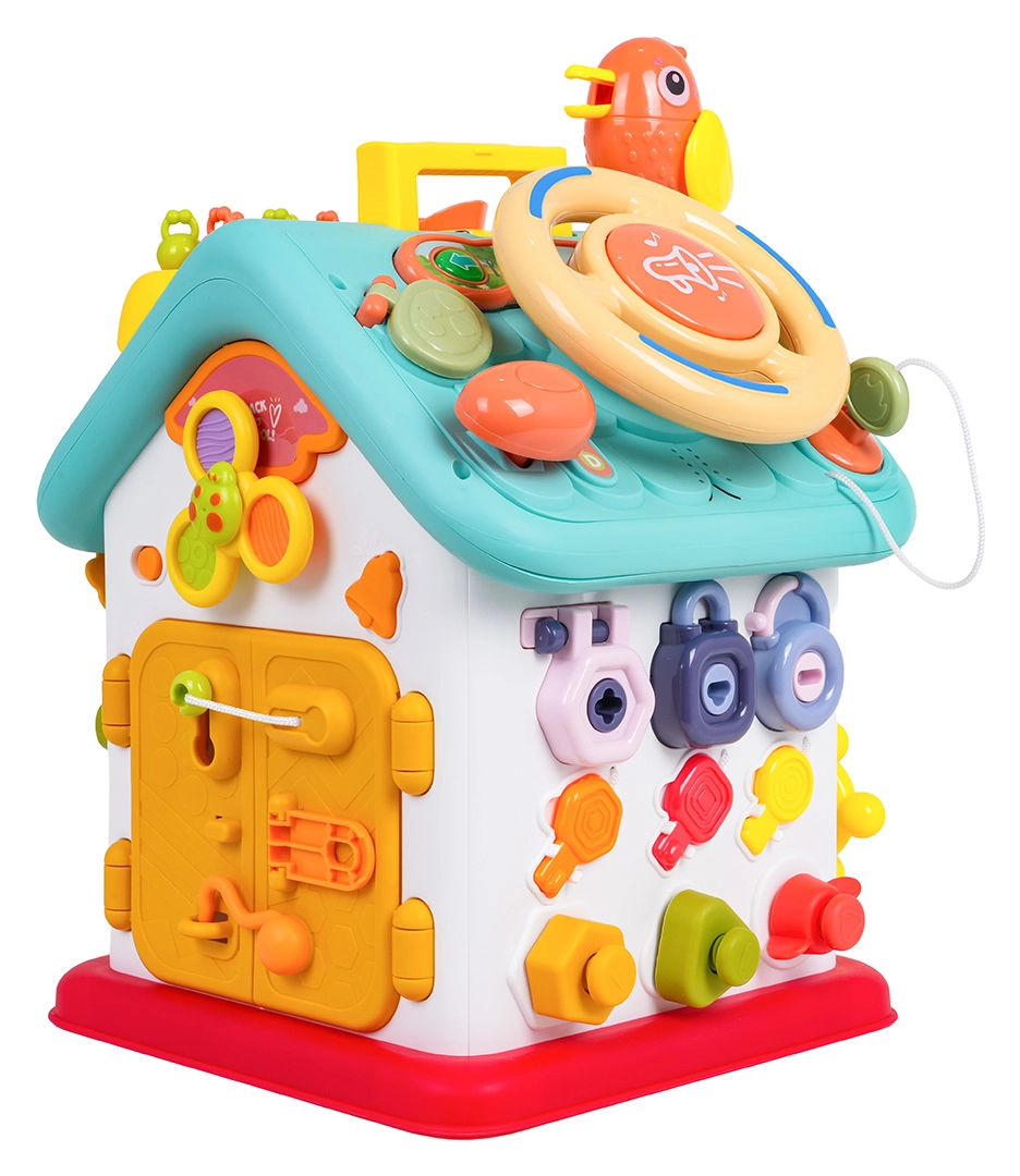 Această căsuță interactivă colorată oferă activități bogate pe toate laturile și pe acoperiș: volan iluminat cu claxon, semnalizări și demaror cu cheie, set de lacăte și chei pentru potrivire, ceas cu limbi mobile, întrerupătoare, angrenaje și alte elemente manipulative. Copiii își exersează coordonarea mână–ochi și înțeleg principiul cauză–efect.