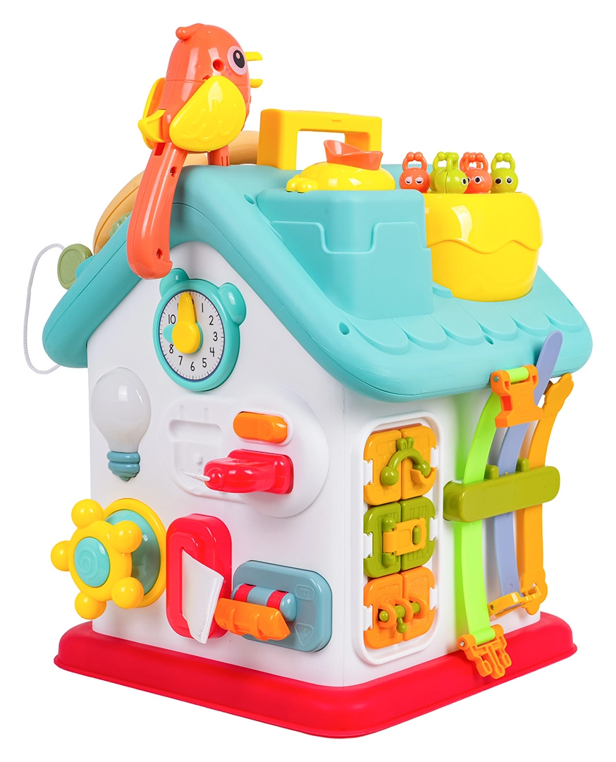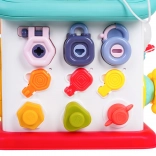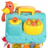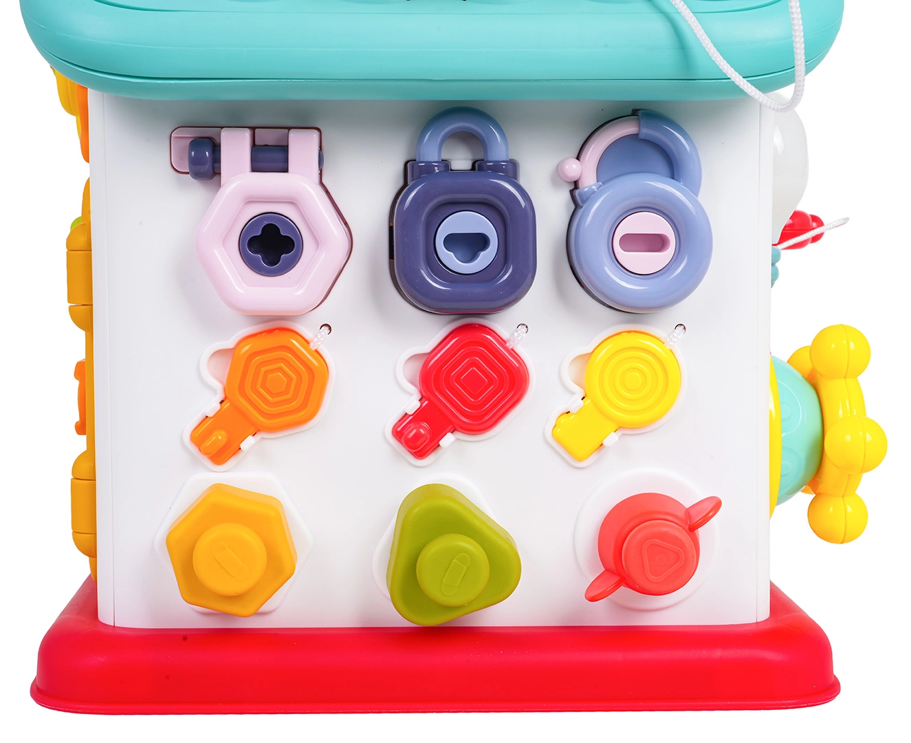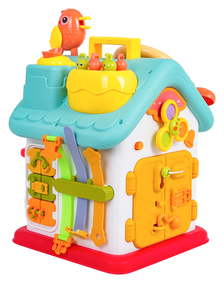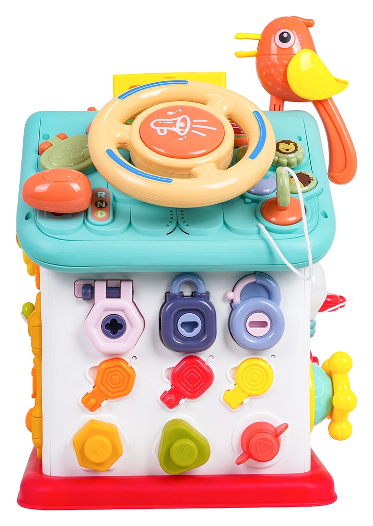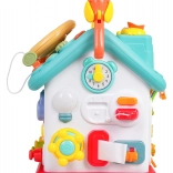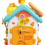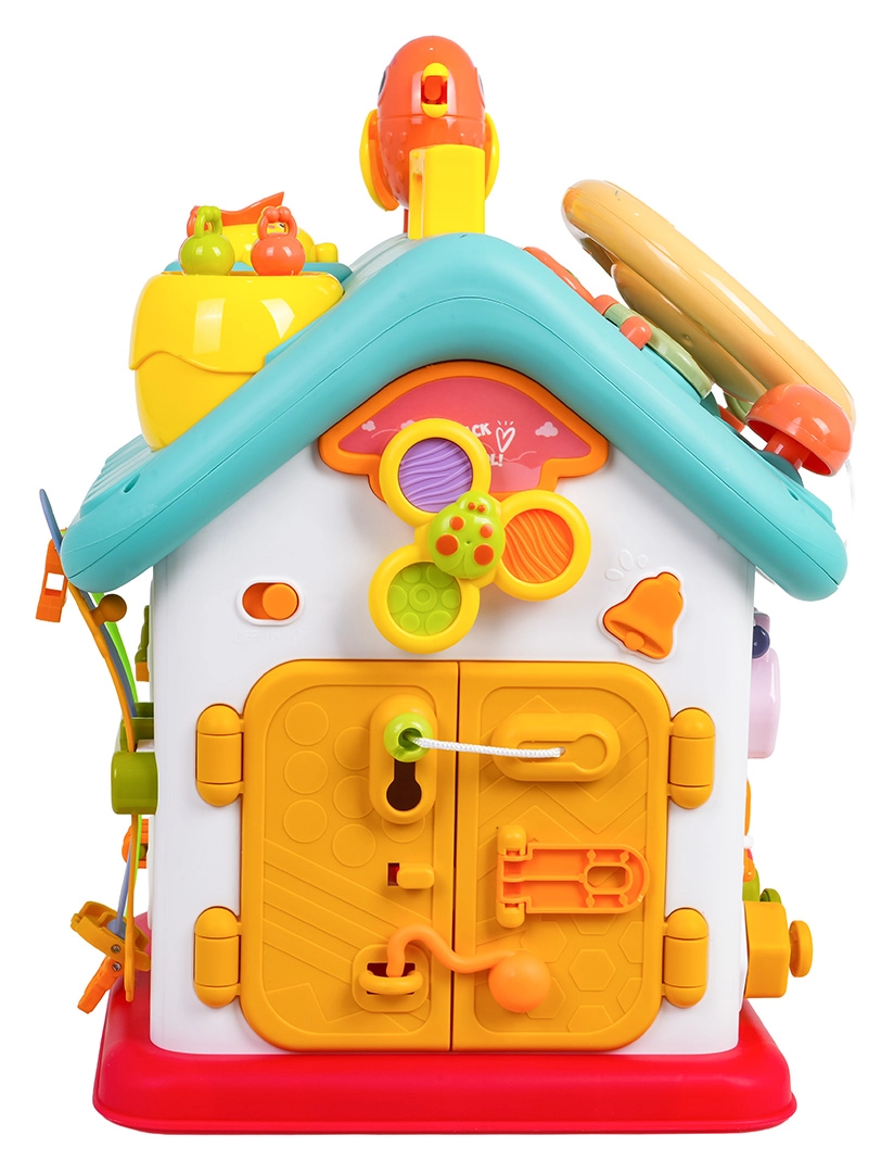 Această căsuță interactivă colorată oferă activități bogate pe toate laturile și pe acoperiș: volan iluminat cu claxon, semnalizări și demaror cu cheie, set de lacăte și chei pentru potrivire, ceas cu limbi mobile, întrerupătoare, angrenaje și alte elemente manipulative. Copiii își exersează coordonarea mână–ochi și înțeleg principiul cauză–efect.