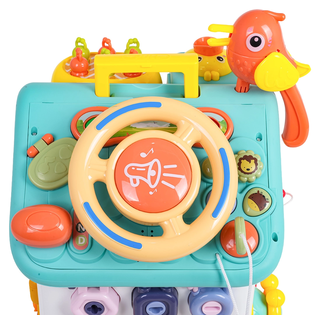Melodii integrate, sunete de vehicule și clopoțel stimulează auzul, în timp ce luminițele și indicatorii care clipesc susțin atenția vizuală. Datorită mânerului, căsuța este ușor de transportat, iar execuția robustă fără muchii ascuțite este ideală pentru joaca de zi cu zi.