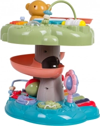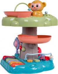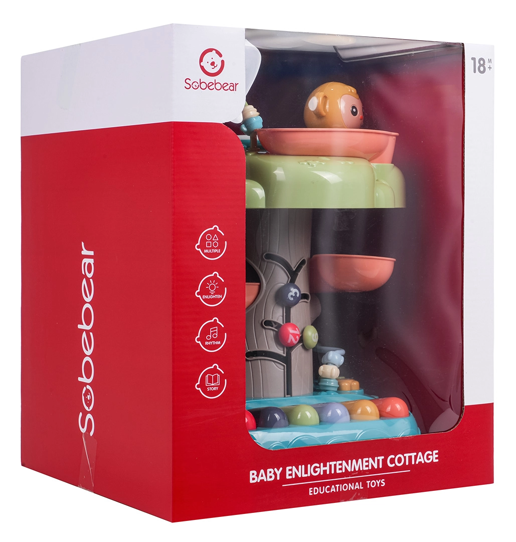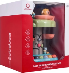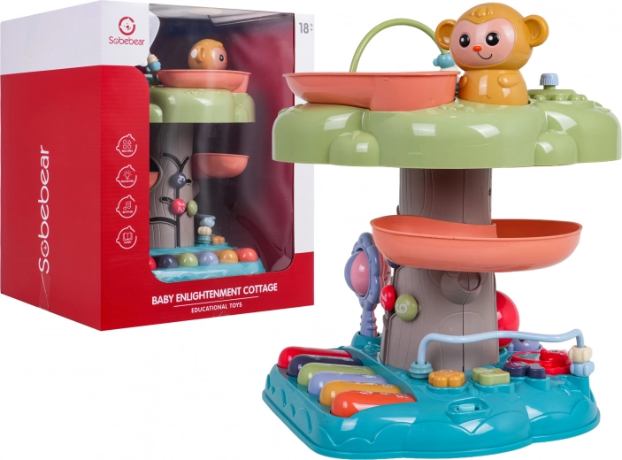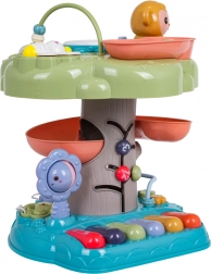 Căsuța interactivă este o jucărie educativă ideală pentru cei mai mici. Îi atrage prin toba muzicală iluminată din vârf, mini-clapiera cu patru moduri (numere, melodii, animale și sunetele lor, tonuri) și traseul în spirală pentru bile, pe care biluțele se rostogolesc vesel în jos. Elementele colorate, luminile și melodiile susțin dezvoltarea senzorială și învățarea relației cauză–efect.