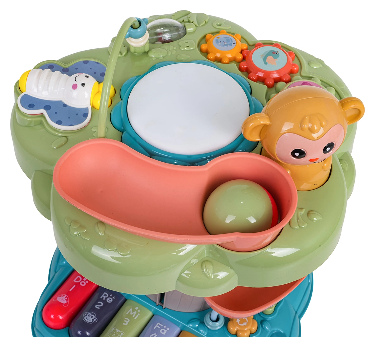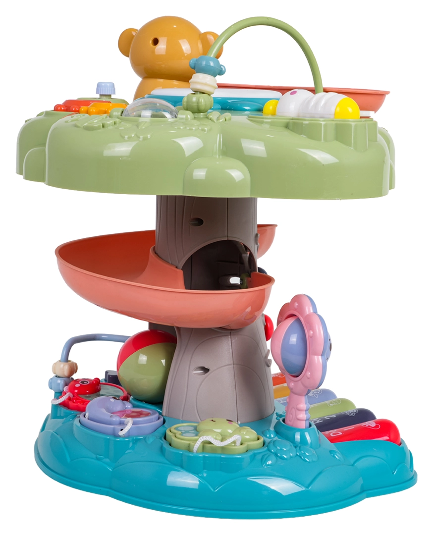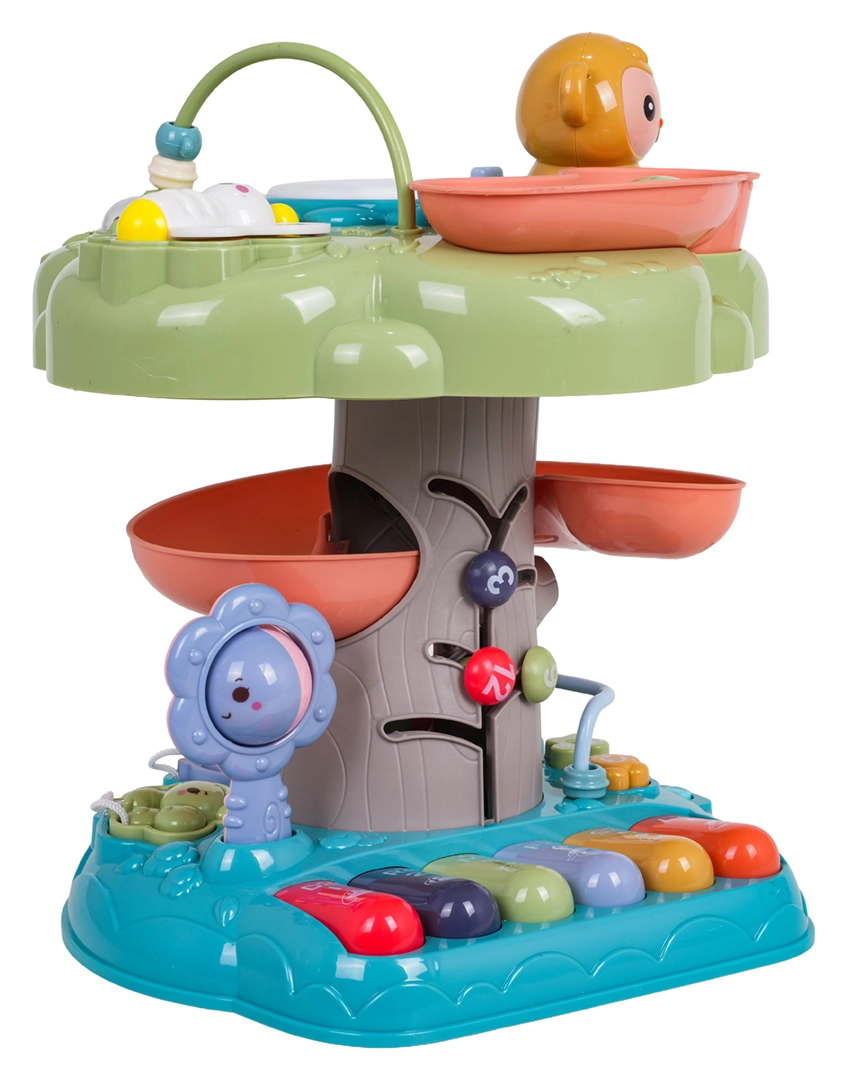 - efecte luminoase și sonore, mini-clapieră cu 4 moduri, tobă, melodii, denumiri de numere și animale, rotițe dințate, mărgele, zornăitoare, potrivire de forme, tobogan în spirală pentru bile