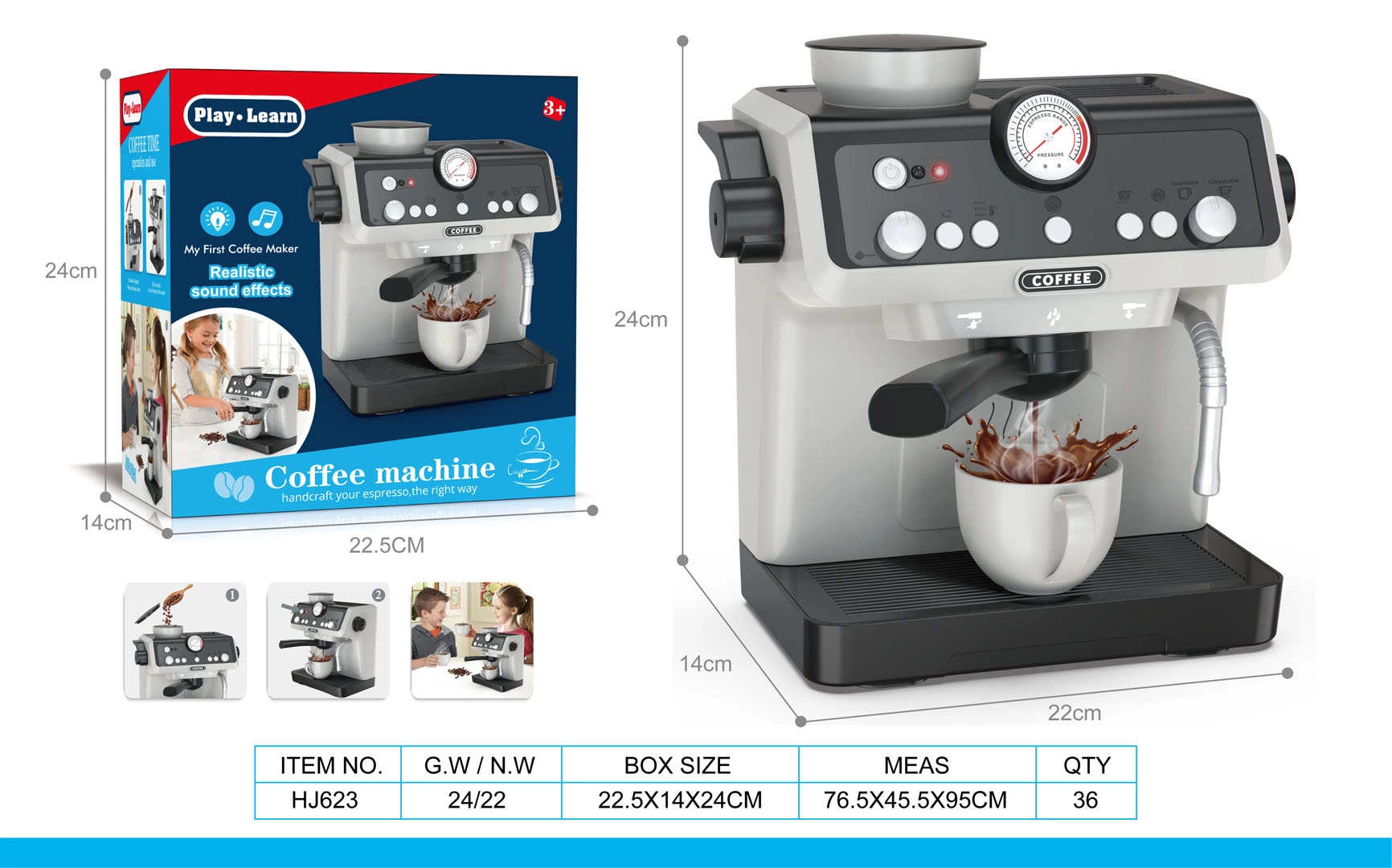 Cafetiera realistă pentru micii barista este realizată din plastic de calitate, cu accent pe detalii. După umplerea rezervorului cu apă și acționarea manetei, se aud sunete autentice de măcinare și fierbere, iar în ceașca inclusă se toarnă cu adevărat apă. La finalul preparării se aude un semnal, iar indicatorul se schimbă de la roșu la verde.