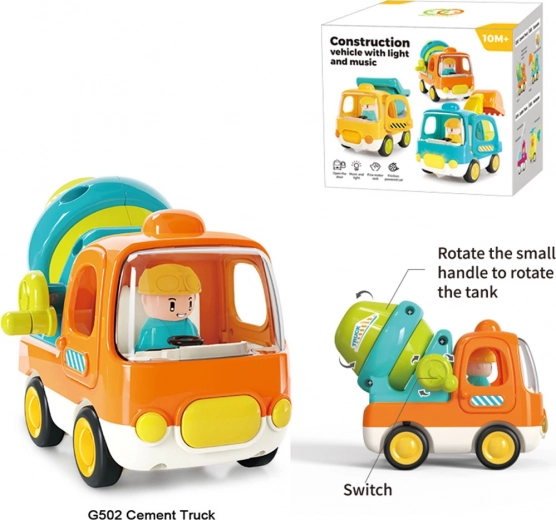 Vehiculul are uși laterale care se deschid și tambur rotativ acționat cu manivelă, care invită la descoperire și dezvoltă motricitatea fină. Melodiile vesele, sunetul de pornire și claxonul vor încânta orice copil și îl vor încuraja la joc creativ.