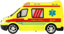 Ambulanța galbenă, cu marcaje AMBULANCE și lumină funcțională, încurajează jocul creativ al micilor salvatori.