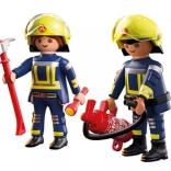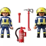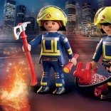 Doi pompieri curajoși din setul PLAYMOBIL Duo Pack sunt pregătiți de intervenție. Cu echipament profesional, precum topor, lanternă și stingător, fac față oricărui incendiu și misiunilor de salvare. Datorită vizierelor mobile de pe căști, au o vizibilitate mai bună și reacție rapidă. Ideal pentru joacă creativă și pentru completarea colecției.