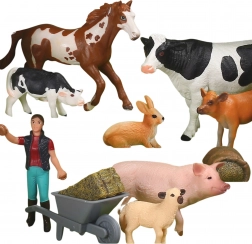 - cal (castaniu cu semn alb), vacă (alb-negru), vițel/vacă (alb-negru), vițel (maro-rojcat), porc (roz deschis), oaie/miel (deschis la culoare), iepure (maro-rojcat), figurină fermieră, roabă, balot de fân
