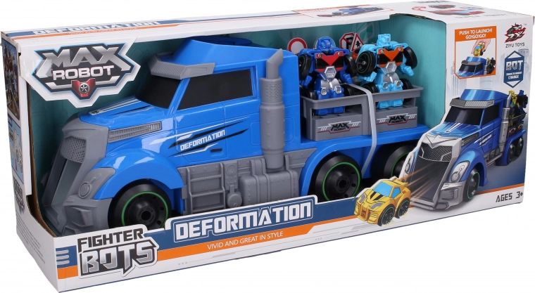 Set distractiv pentru micii fani ai roboților și mașinilor, care aduce o bază cu rampă și doi roboți transformabili. Include și un camion – bază mobilă – și indicatoare rutiere pentru un joc realist. Copiii se vor bucura de ore întregi de distracție creativă și de dezvoltarea imaginației datorită transformării ușoare și bazei portabile. Transformarea robotului în autocamion, camion mobil–bază de 38 cm, rampă pentru curse pline de acțiune și semnalizare rutieră fac din acest set un cadou grozav.