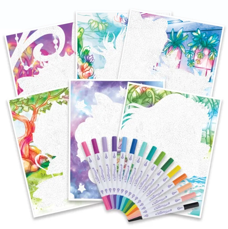 Totul este depozitat într-o carcasă magnetică rigidă, care protejează paginile și marcerele. Markerele cu două capete oferă o gamă largă de nuanțe pentru colorarea precisă a detaliilor și a suprafețelor. Setul este, de asemenea, un cadou excelent pentru toți iubitorii de desen și motive fantastice.