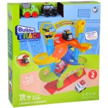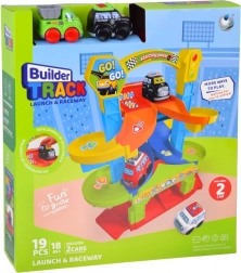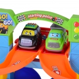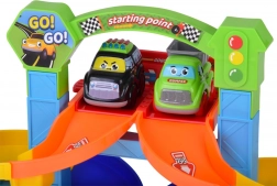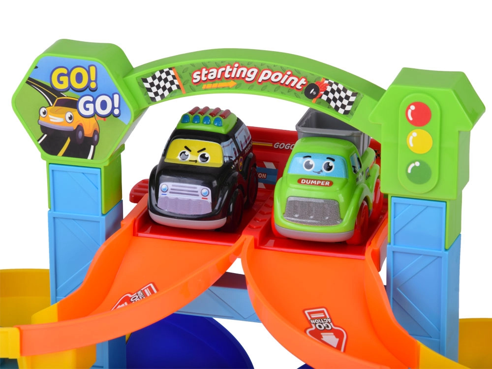 Turnul dublu de lansare, cu „starting point” și o manetă, eliberează simultan două mașinuțe. Copiii se bucură de un start palpitant și pot concura umăr la umăr.