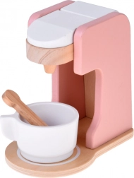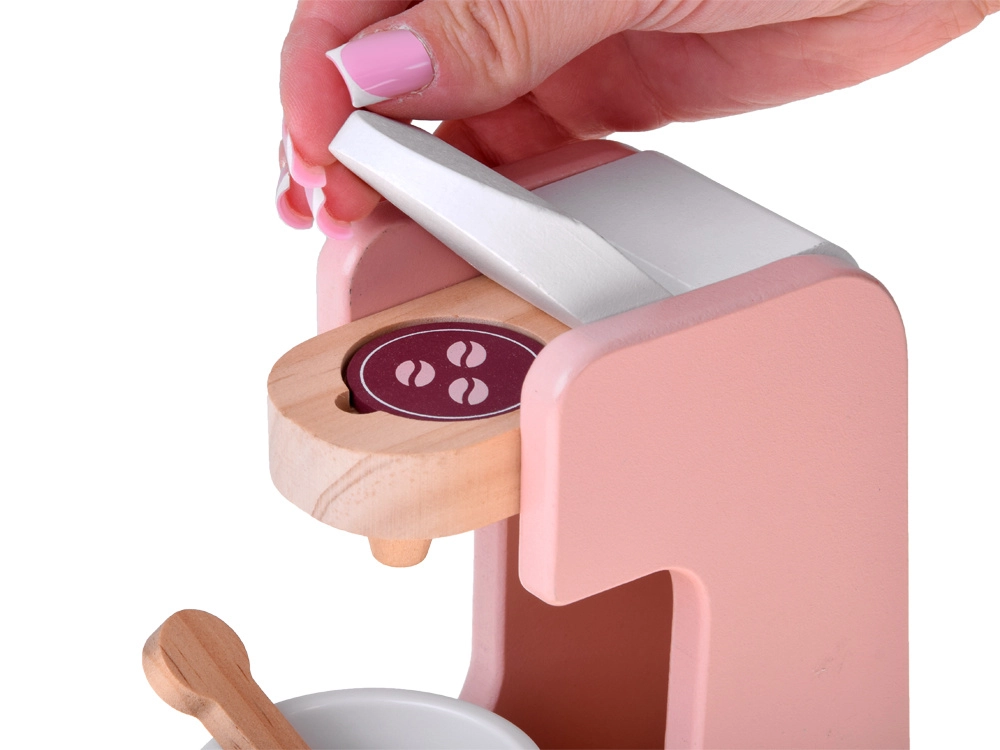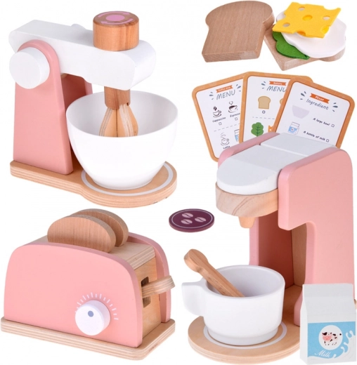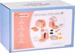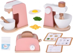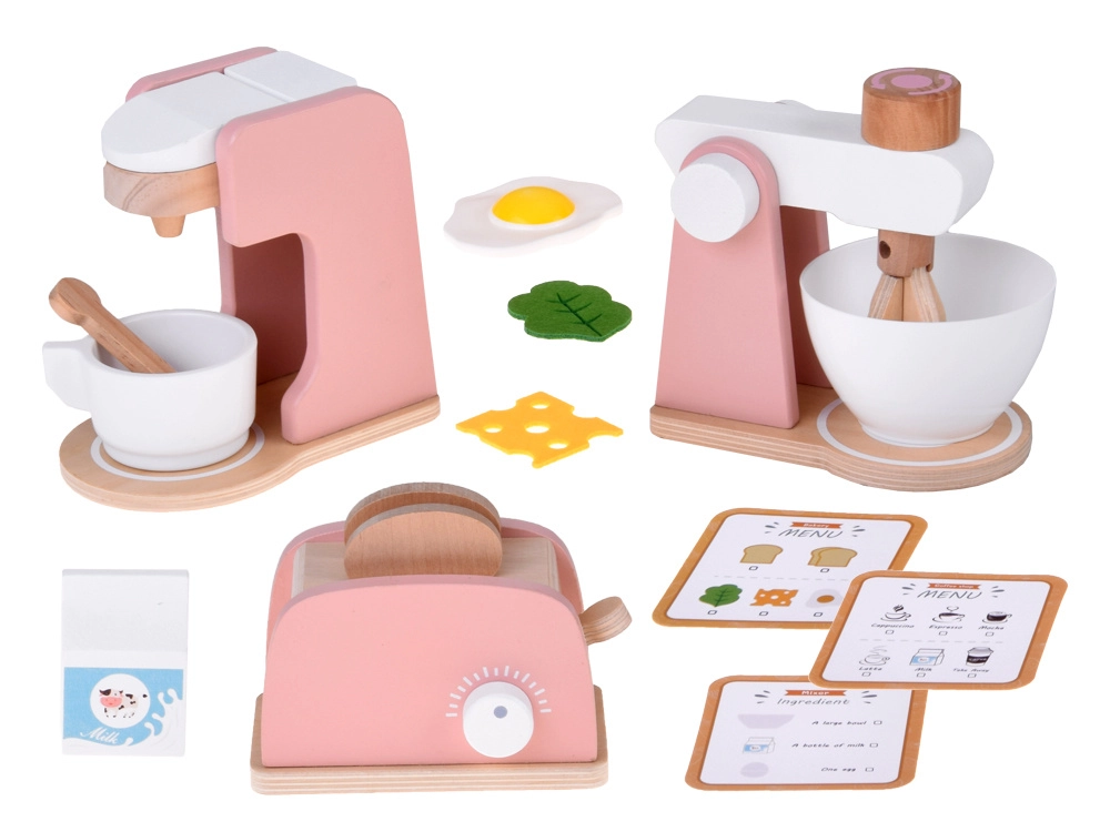 Setul elegant din lemn de mici electrocasnice aduce bucătăria copiilor în lumea fanteziei. Include un prăjitor de pâine cu manetă și buton rotativ, o cafetieră cu ceașcă, linguriță și capsulă și un mixer cu stativ cu bol și accesoriu tel rotativ. Lemn natural de calitate, vopsele netoxice și design pastelat asigură un joc sigur și plăcut, care dezvoltă motricitatea fină, creativitatea și jocul de rol.
