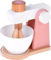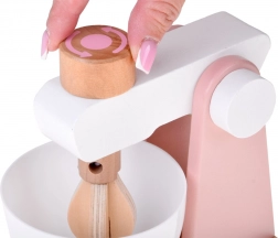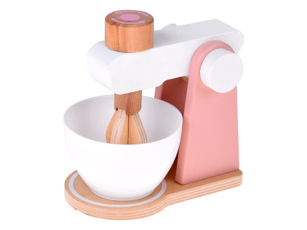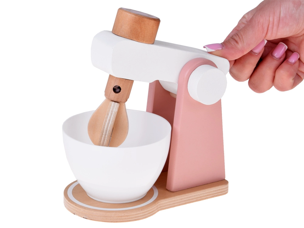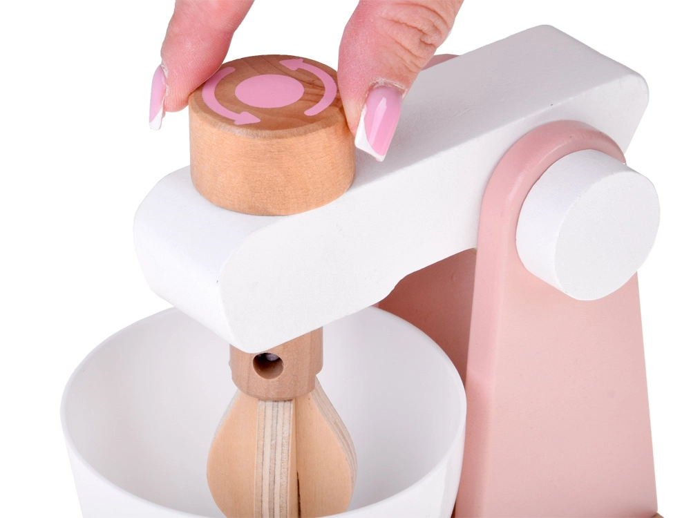 Construcție stabilă din lemn, bol detașabil și buton rotativ funcțional pentru simularea amestecării aluatului sau a cremei. Ideal pentru micul cofetar.
