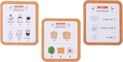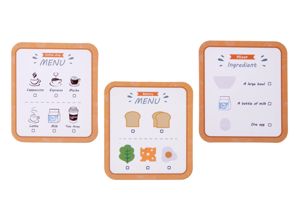 - prăjitor de pâine, cafetieră, mixer cu stativ, 2 felii de toast, ou, felie de cașcaval, frunză de salată, cutie de lapte, capsulă de cafea, ceașcă, linguriță, carduri de meniu