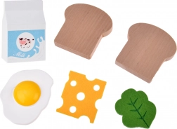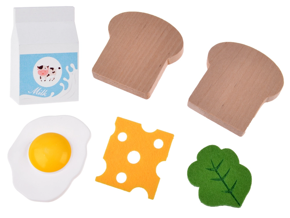 Include accesorii bogate: felii de pâine din lemn, ou fals, felie de cașcaval, frunză de salată, cutie de lapte, capsulă de cafea și carduri de meniu/rețete pentru un joc și mai distractiv.