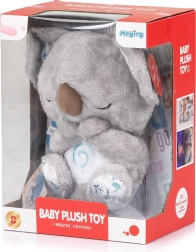 Liniștește-ți bebelușul cu koala moale, care oferă „respirație” luminoasă, melodii liniștitoare și lumină delicată pentru adormire ușoară. Jucăria de pluș ușoară și sigură este ideală acasă și în călătorii, alimentată cu baterii într-un compartiment sigur închis.