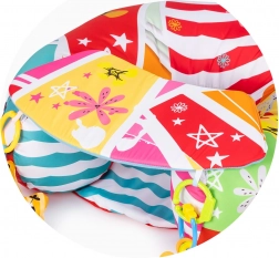 Datorită umpluturii moi și stabile oferă sprijin sigur, în timp ce modelele colorate și elementele interactive ajută la dezvoltarea simțurilor și a coordonării mână–ochi. Materialul practic se curăță ușor, fiind pregătit pentru aventurile zilnice.