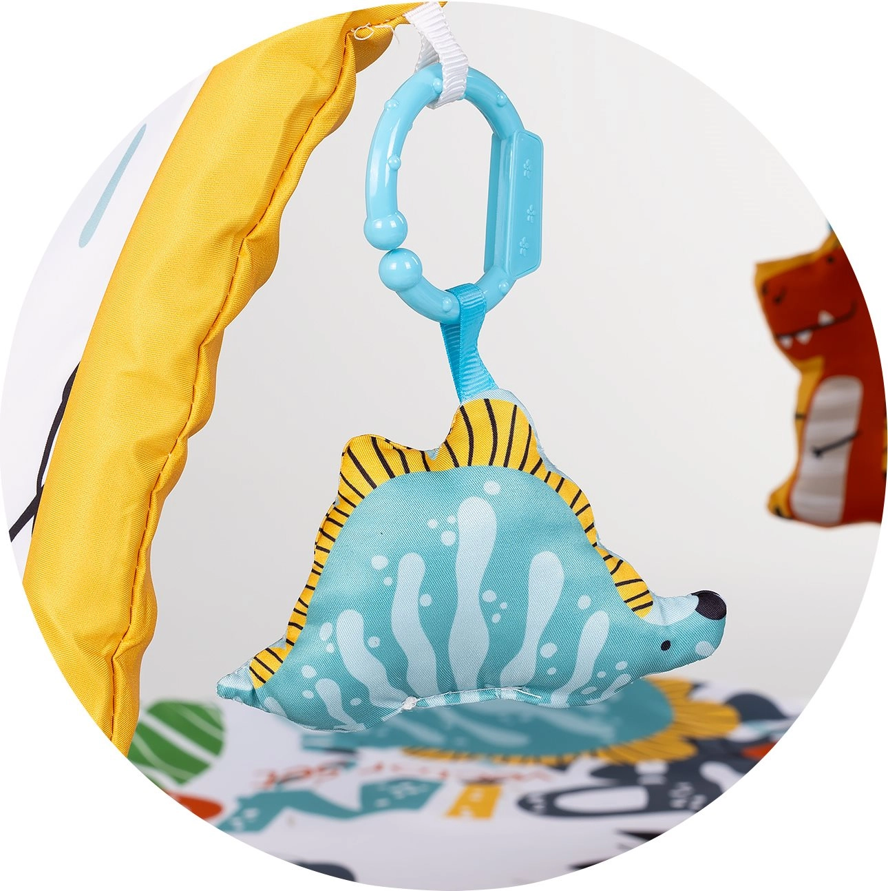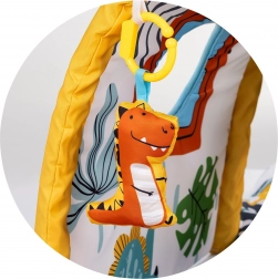 Salteaua căptușită cu arc și jucării atârnate îl motivează pe bebeluș să apuce și întărește coordonarea mână–ochi.